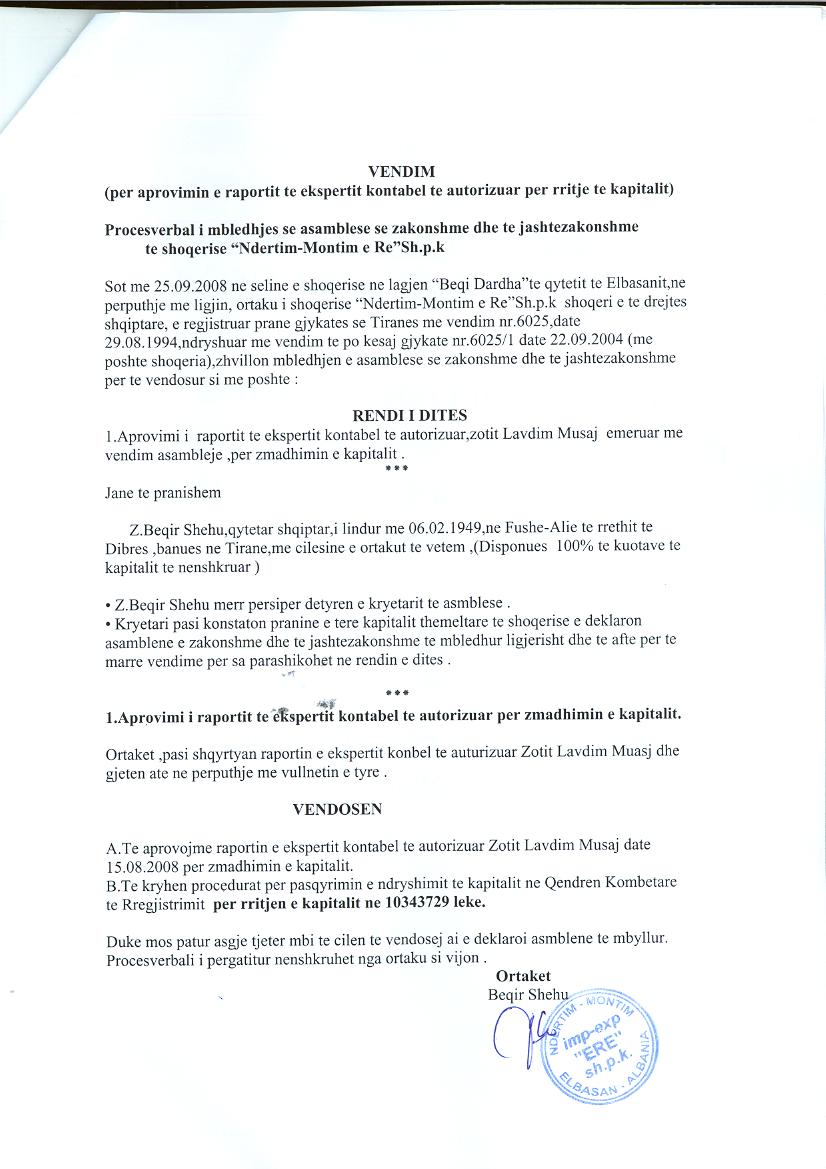 → Ekstrakt historik i regjistrit tregtar date 18.11.2021 → Akti i themelimit dhe statuti → Kontrate shitje pasurive te luajtshme date 15.07.2004 → Vendimi i asamblese se zakonshme per aprovimin e raporti te ekspertit kontabel per zmadhimin e kapitalit date 25.09.2008 → Vendimi i ortakut te vetem per zmadhimin e kapitalit date 03.12.2014 |
