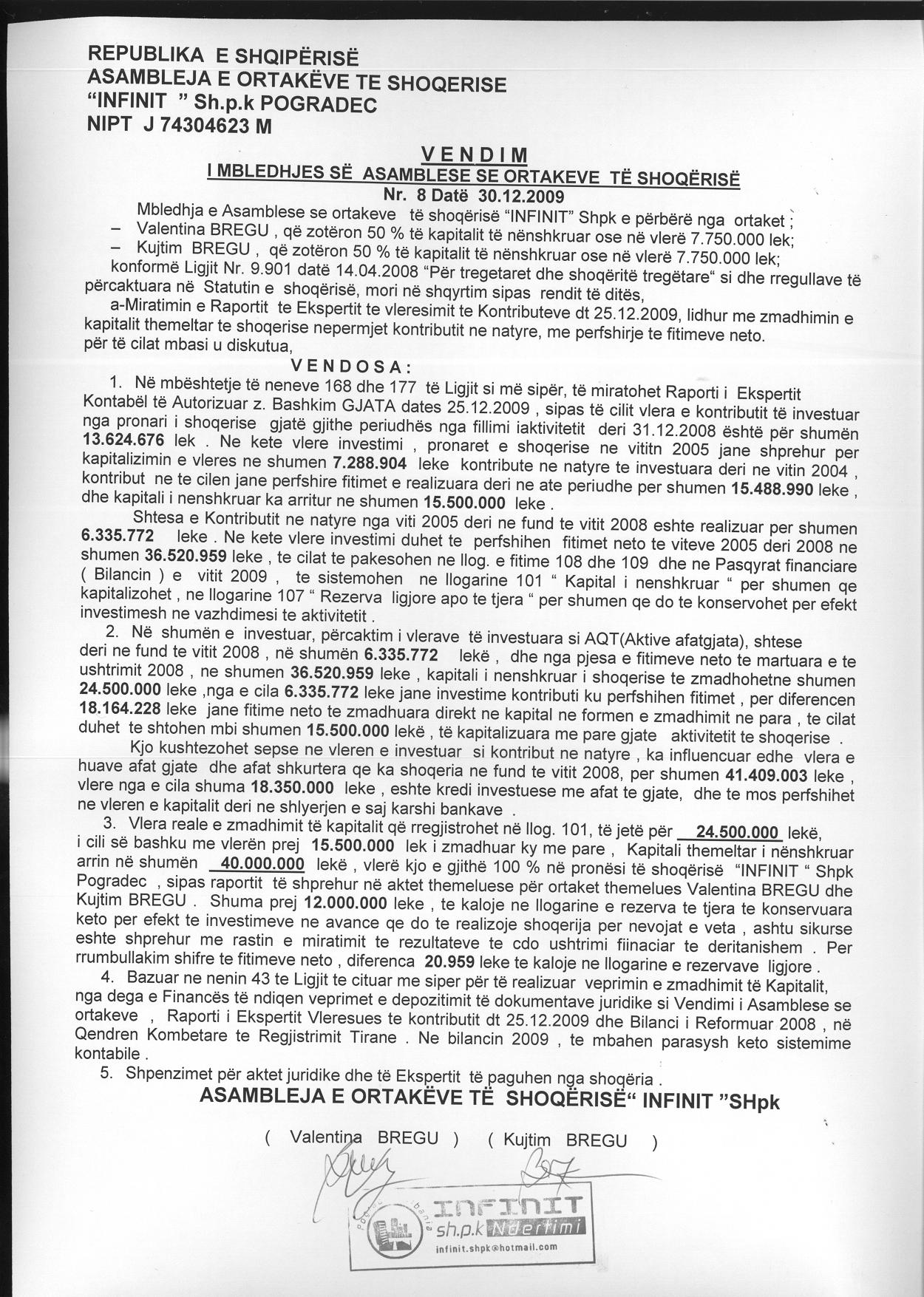 → Ekstrakt historik i regjistrit tregtar 10.06.2022 → Akti i themelimit → Kontrate dhurimi 17.01.2020 → Vendimi i asamblese se ortakeve per zmadhimin e kapitalit 11.12.2014 → Vendimi i asamblese se ortakeve per zmadhimin e kapitalit 30.12.2009 → Ekstrakt Historik i Regjistrit Tregtar date 11.06.2025 |