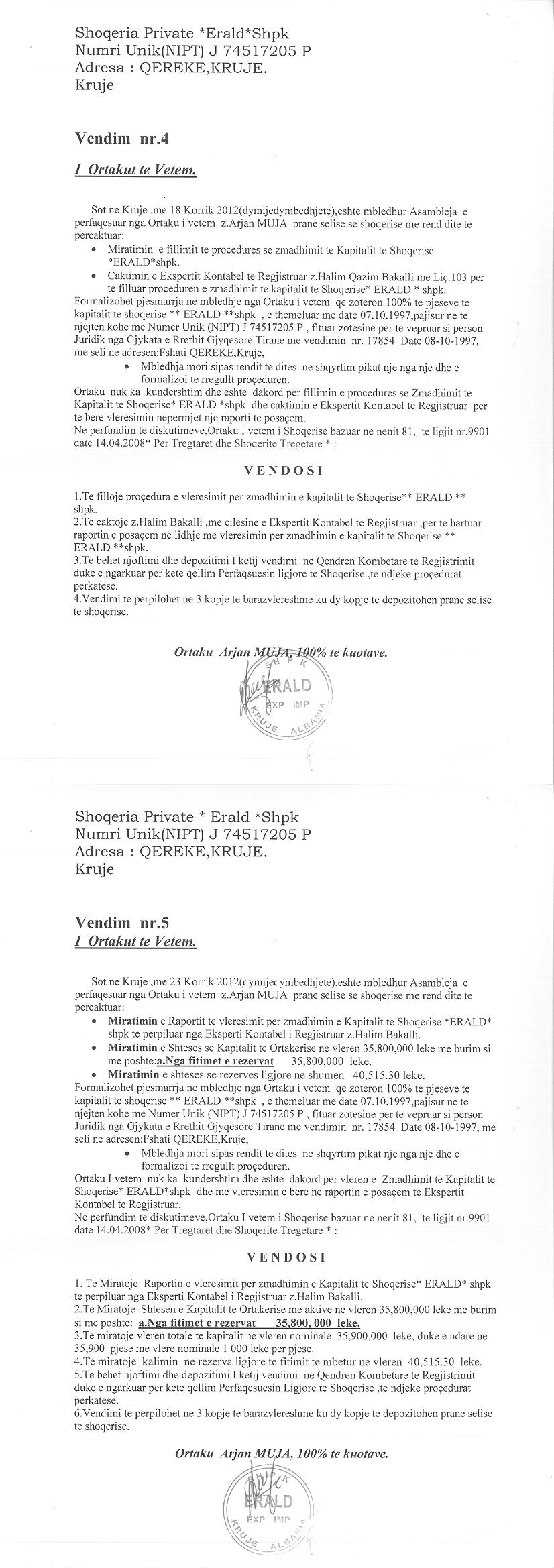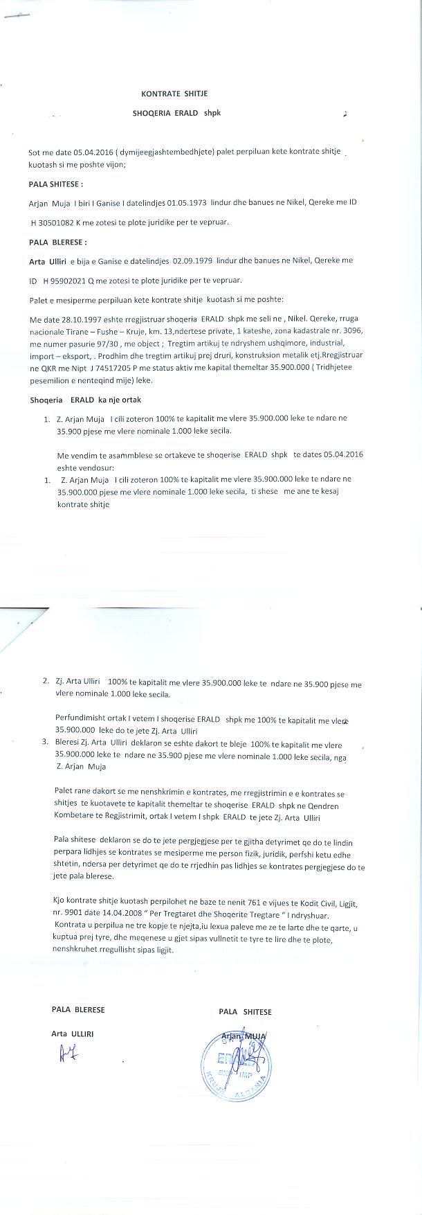 → Ekstrakt historik i regjistrit tregtar date 17.06.2022 → Akti i themelimit dhe statuti → Kontrate shitje date 05.04.2016 → Vendimi i ortakut te vetem per rritjen e kapitalit date 18.07.2012 → Ekstrakti Historik i Regjistrit Tregtar date 06.05.2023 → Kontrate Shitje Kuotash date 23.09.2022 → Ekstrakt Historik i Regjistrit Tregtar date 24.09.2024 |