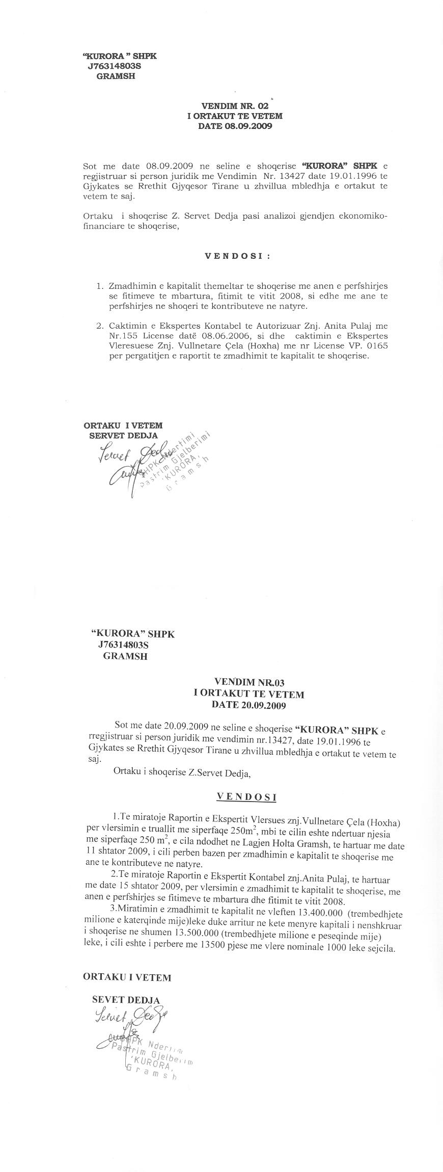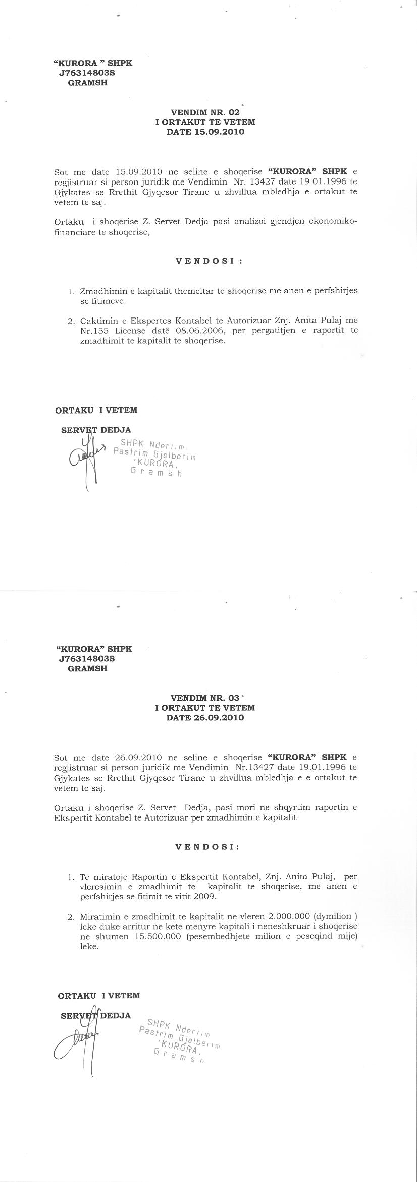 → Ekstrakt historik i regjistrit tregtar 10.03.2021 → Akti i themelimit dhe statuti → Vendimi i ortakut te vetem per zmadhimin e kapitalit 15.09.2010 → Vendim i ortakut te vetem per zmadhimin e kapitalit 08.09.2009 |