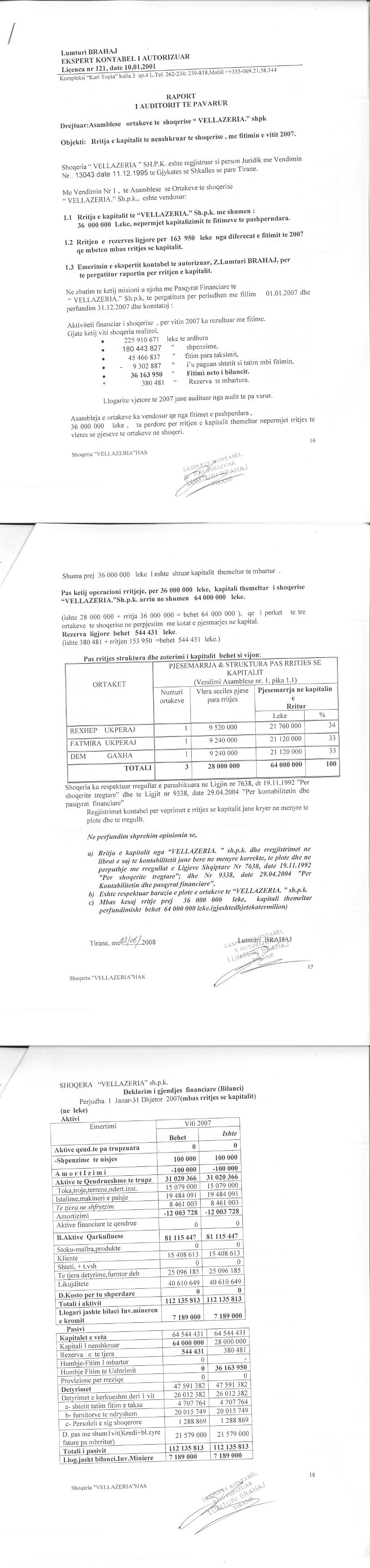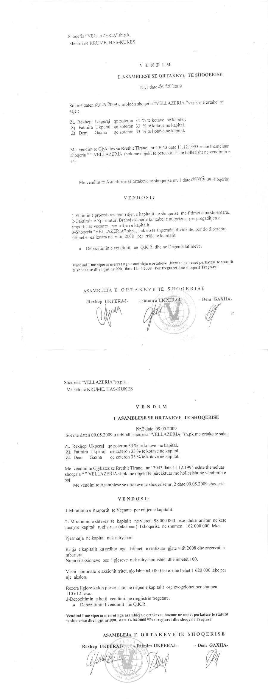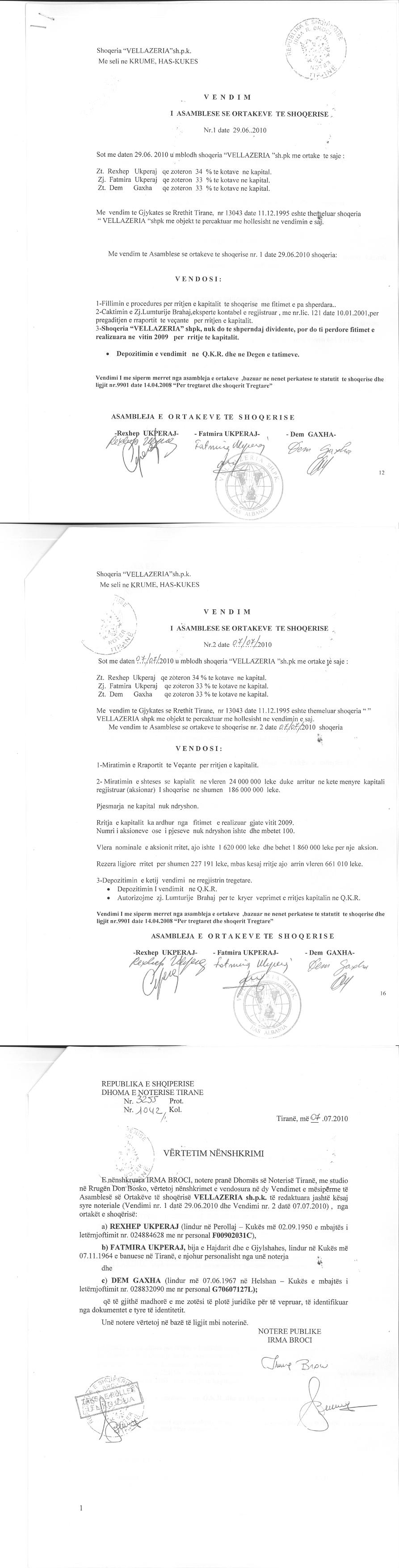 → Ekstrakt historik i regjistrit tregtar 05.07.2021 → Akti i themelimit dhe statuti → Kontrate shit-blerje e pasurive te paluajtshme date 29.12.2017 → Raport i auditorit te pavarur per rritjen e kapitalit date 02.06.2008 → Kontrate shit-blerje kuotash date 04.11.2004 → Vendimi i asamblese se ortakeve dhe kontrata e shitjes se kuotave date 10.04.2008 → Kontrate shit-blerje e pasurise se luajtshme date 30.12.2016 → Kontrate dhurimi e pasurise se luajtshme date 14.04.2016 → Vendimi i asamblese se ortakeve per rritjen e kapitalit date 29.06.2019 → Vendimi i asamblese se ortakeve per rritjen e kapitalit date 25.06.2012 → Vendim i asamblese se ortakeve per rritjen e kapitalit date 05.05.2009 |