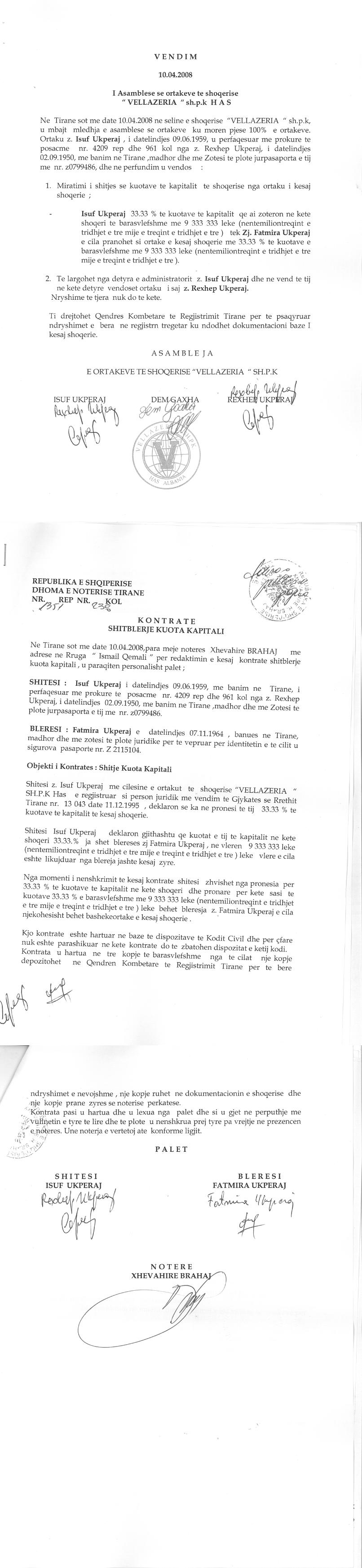 | Çështje Ligjore: | I. Me date 10.06.2013, me ane te Urdhrit Nr. 382 Regj. Nr.382/5 Prot, lëshuar nga Shoqëria Përmbarimore “JUS” sh.p.k, u urdherua vendosja e sekuestros mbi kuotat që zotëron debitori shoqeria “VËLLAZËRIA " shpk, me NUIS (NIPT) J76418901I, dhe te drejtave qe rrjedhin nga zoterimi i kuotave per shumen e detyrimit prej 1.341.537 leke. II. Me date 21.06.2013, me ane te Urdhrit Nr.382/21 Prot, Nr.382 Regj date "Per Heqjen e Sekuestros Konservative”, leshuar nga Shoqeria Permbarimore “JUS” sh.p.k, drejtuar QKR, u urdherua heqja e mases se sekuestros konservative nga kuota, aksione aktive dhe biznese te regjistruara ne emer te “VELLAZERIA” shpk me NIPT J76418901I. III. Me date 01.06.2015, me ane te urdhrit Nr. 25/11 Akti, lëshuar nga Shoqëria Përmbarimore “Besnik Bajraktari” shpk, u urdherua vendosja e masës së sekuestros konservative mbi të gjitha aksionet e regjistruara në emër të debitorit, “Vellazeria” shpk, me NUIS (NIPT) J76418901I. IV. Me date 09.06.2015, me ane te urdherit, Nr.25/19 i Aktit, lëshuar nga zyra permbarimore “ Besnik Bajraktari”, u urdherua heqja e mases se sekuestros konservative te vendosur me urdherin nr.25/11, date: 01.06.2015, mbi aksionet e shoqerise “ VELLAZERIA”, me NUIS J76418901I. V. Me date 20.02.2017, me ane te Urdhrit Nr.1296 Prot, protokolluar nga QKB me Nr.2596 Prot., date 21.02.2017, leshuar nga Shoqeria e Sherbimit Privat "E.P.S.A" sh.p.k, u urdherua bllokimi i kuotave/ aksioneve dhe te drejtave qe rrjedhin nga zoterimi i kuotave per subjektin "VËLLAZËRIA" sh.p.k me NUIS (NIPT) J76418901I, me administrator Dem Gaxha, te lartpermendur deri ne nje urdher te dyte nga permbaruesi gjyqesor. VI. Me date 19.04.2017, me ane te Urdhrit Nr.1059/3 Prot, protokolluar nga QKB me Nr.6305 Prot. date 28.04.2017, leshuar nga shoqeria permbarimore JUSTITIA shpk, u urdherua vendosja e sekuestros konservative ne aktivitetet e pales debitore Shoqeria VËLLAZËRIA sh.p.k me Nipt J76418901I. VII. Me date 15.05.2017, me ane te urdhrit Nr.1307/3 Prot, lëshuar nga Shoqëria permbarimore Justitia, u urdherua heqja e menjehershme e masës së sekuestros konservative në aktivitetet e pales debitore shoqeria “VËLLAZËRIA” sh.p.k, me NUIS (NIPT) - J76418901I. VIII. Me date 05.09.2017, me ane te urdhrit Nr.5167 Prot, Nr. 408 Dosje, lëshuar nga Shoqëria permbarimore E.P.S.A, u urdherua heqja e masës së sekuestros konservative nga shoqeria “VËLLAZËRIA” sh.p.k, me NUIS (NIPT) - J76418901I. |