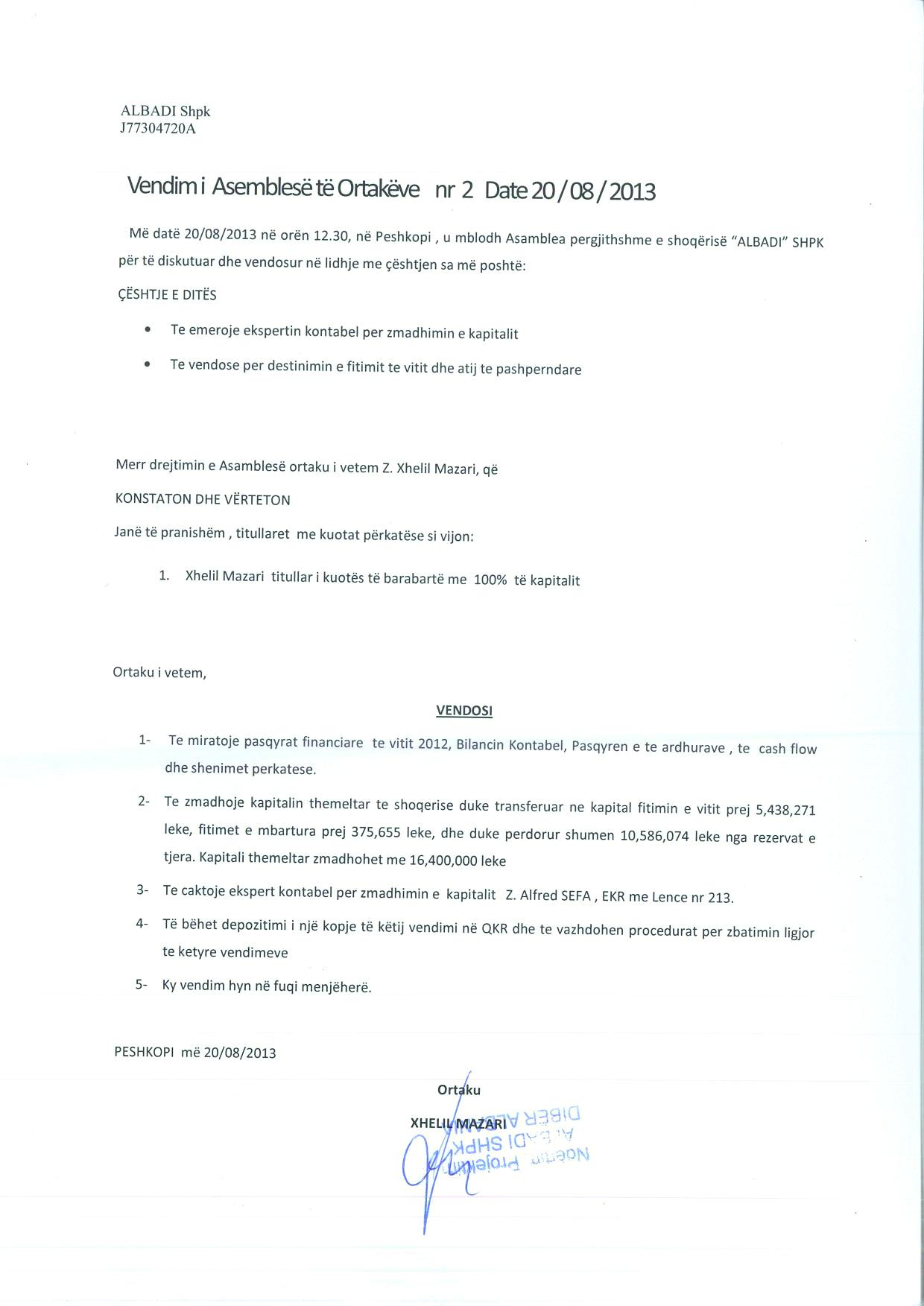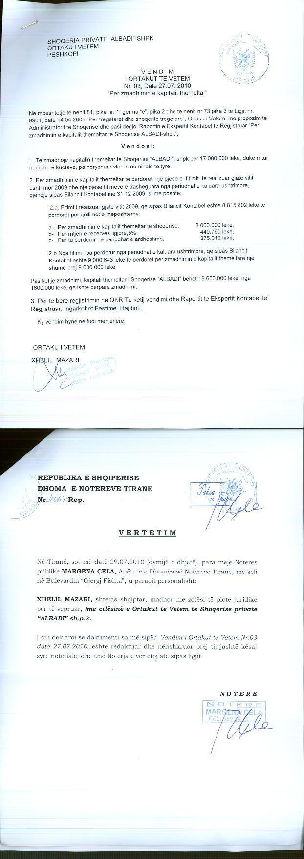 → Ekstrakt historik i regjistrit tregtar date 26.11.2021 → Akti i themelimit dhe statuti → Vendimi i asamblese se ortakeve per zmadhimin e kapitalit date 20.08.2013 → Vendim i ortakut te vetem per zmadhimin e kapitalit date 27.07.2010 |