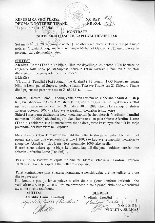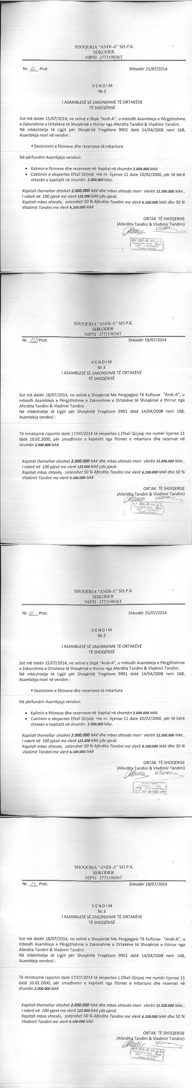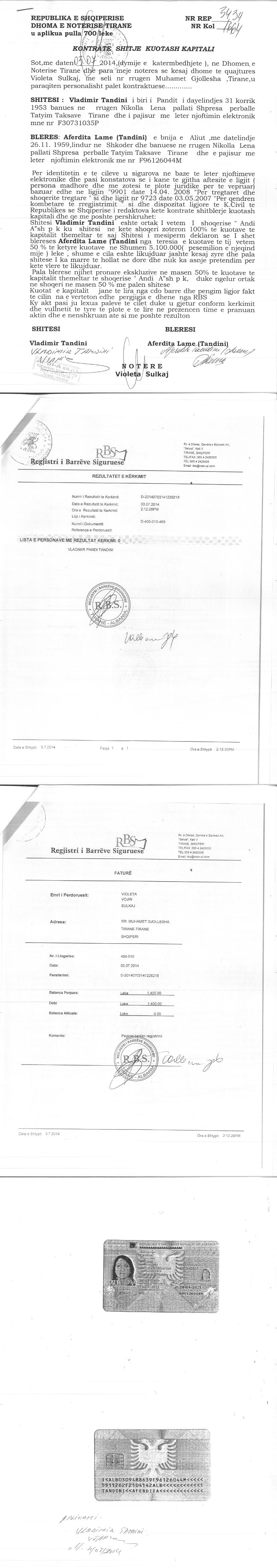 → Ekstrakt historik i regjistrit tregtar date 23.12.2021 → Akti i themelimit dhe statuti → Kontrate shitje kuotash kapitali date 03.07.2014 → Kontrate shitje kuotash kapitali date 11.02.2009 → Vendimi i asamblese se ortakeve per zmadhimin e kapitalit date 28.06.2012 → Vendimi i asamblese se ortakeve per zmadhimin e kapitalit date 15.07.2014 |