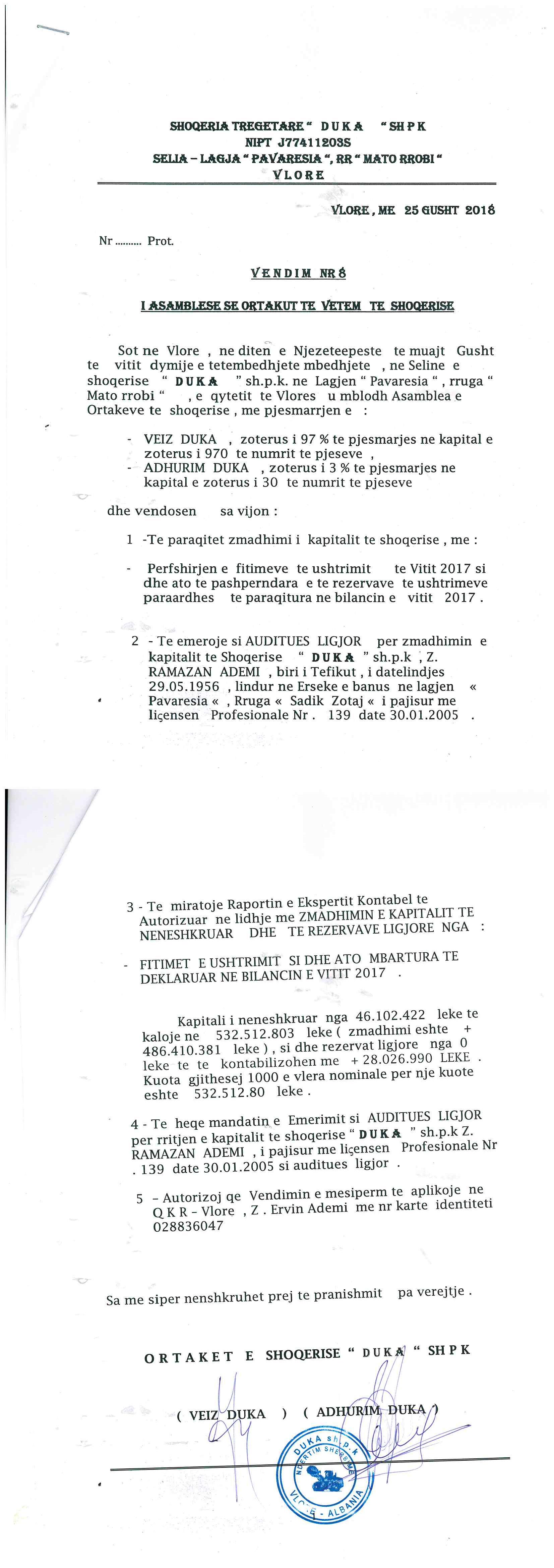 | Çështje Ligjore: | I. Me date 30.01.2010, u perfundua procesi i bashkimit me perthithje te shoqerise “DUKA” shpk si shoqeri perthithese dhe shoqerise “D1-ALB” shpk si shoqeri e perthithur. Te gjitha te drejtat dhe detyrimet e shoqerise “D1-ALB” shpk kalojne ne favor te shoqerise perthithese “DUKA” shpk. Shoqeria qe perthithet “D1-ALB” SHPK vleresohet e prishur pa likujdim duke kaluar ne statusin “C’regjistruar”. II. Me date 14.10.2014, me ane te urdhrit Nr. 1521 Prot, Nr.357 Dosje, lëshuar nga Shoqëria Përmbarimore Private “Vako & Partners Bailiff Service” sh.p.k, u urdherua vendosja e masës së sekuestros konservative mbi të gjitha aksionet e zotëruara nga debitori shoqëria “DUKA"” sh.p.k, me NIPT J77411203S. III. Me date 14.10.2014, me ane te Urdhrit Nr.357 Dosje, Nr.1521 Prot "Për Vënien e Sekuestros Konservative", lëshuar nga Shoqëria Përmbarimore Private "Vako & Partners Bailiff Service", u urdherua vendosja e masës së sekuestros konservative mbi të gjitha aksionet e zotëruara nga debitori, shoqëria "DUKA" SHPK, me NIPT J77411203S. IV. Me date 29.10.2014, me ane te Vendimit Nr.1624 Prot, Nr.357 Dosje, lëshuar nga shoqeria Përmbarimore “Vako & Partners Bailff Service” sh.p.k, u urdherua zhbllokimi i aksioneve apo kredive te shoqerise “DUKA” me Nipt: J77411203S, te bllokuara me ane te shkreses Nr. 1522 Prot, me date 14.10.2014 te Shoqerise Përmbarimore “Vako & Partners Bailff Service”. V. Me date 29.10.2014, me ane te vendimit nr.1624 prot, Nr.357 Dosje, lëshuar nga Shoqeria Përmbarimore “Vako & Partners Bailff Service” sh.p.k, u urdherua zhbllokimi i aksioneve apo kredive te shoqerise “DUKA” me Nipt: J77411203S, te bllokuara me ane te shkreses Nr.1522 Prot, me date 14.10.2014 te Shoqeria Përmbarimore “Vako & Partners Bailff Service”. VI. Me date 19.06.2020, me ane te Urdhrit Nr.637 Prot., Nr.1963/1 Dosje, leshuar nga Zyra Permbarimore "TDR Group" shpk, protokolluar nga QKB Nr.5421 Prot., date 22.06.2020, u urdherua vendosja e mases se sekuestros konservative mbi te gjitha aksionet e zoteruara nga shoqeria "DUKA" shpk, me Nuis (NIPT) J77411203S. VII. Me date 23.06.2020, me ane te Urdhrit Nr.653 Prot, Nr.1963/1 Dosje "Vendim për pushimin e Ekzekutimit", lëshuar nga "Shërbimi Përmbarimor TDR GROUP", u vendos qe Qendra Kombëtare e Biznesit të zhbllokojë nga masa e sekuestros konservative menjëherë aksionet e zotëruara nga shoqëria "DUKA" shpk me NUIS (NIPT) J77411203S, bllokuar me shkresën Nr. 637 Prot, datë 16.06.2020, të shoqërisë Përmbarimore Private "TDR GROUP". |