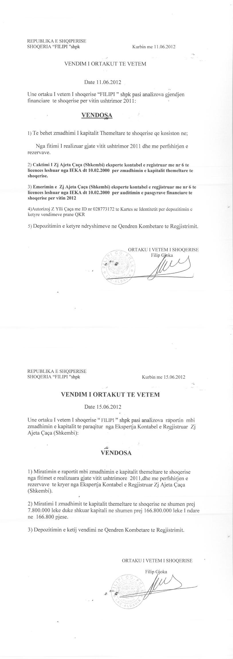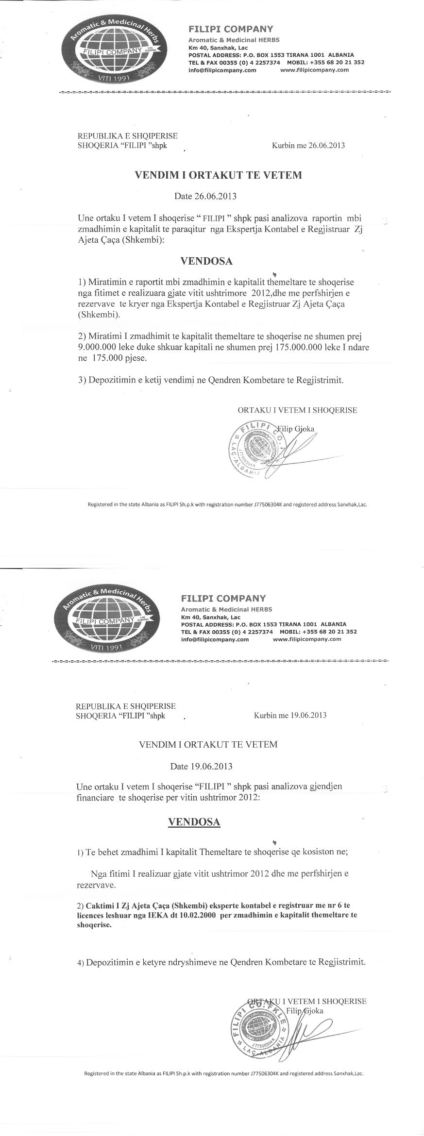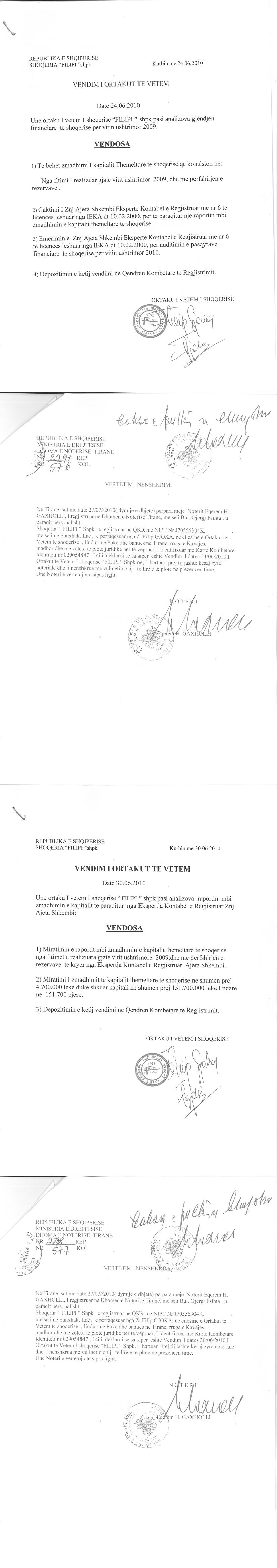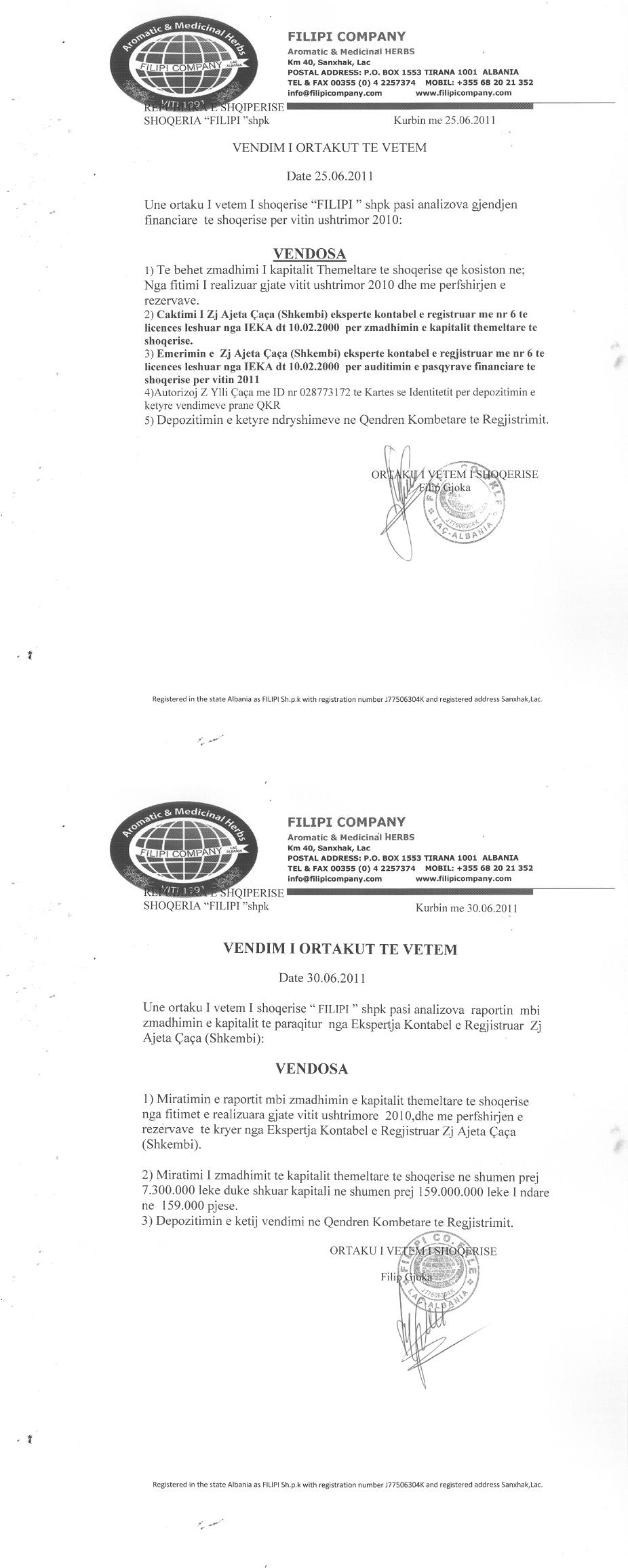 → Ekstrakti Historik i Regjistrit Tregtar date 23.02.2022 → Statuti i shoqerise dhe dokumenta te ndryshem → Vendim i ortakut te vetëm te shoqërisë date 24.06.2010 → Vendim i ortakut te vetëm te shoqërisë date 25.06.2011 → Vendim i ortakut te vetëm te shoqërisë date 11.06.2012 → Vendim i ortakut te vetëm te shoqërisë date 26.06.2013 → Vendim i ortakut te vetëm te shoqërisë date 01.07.2019 |