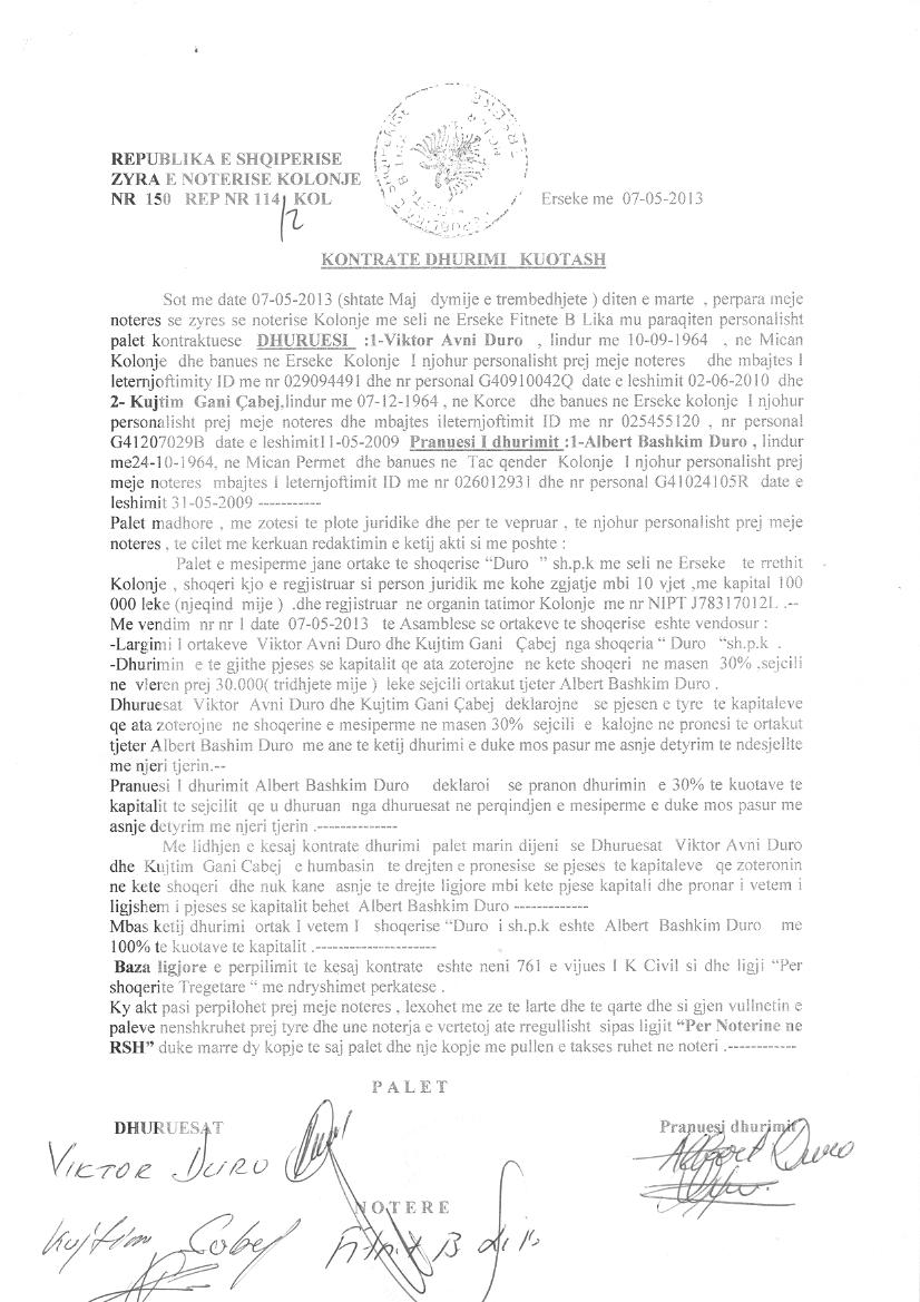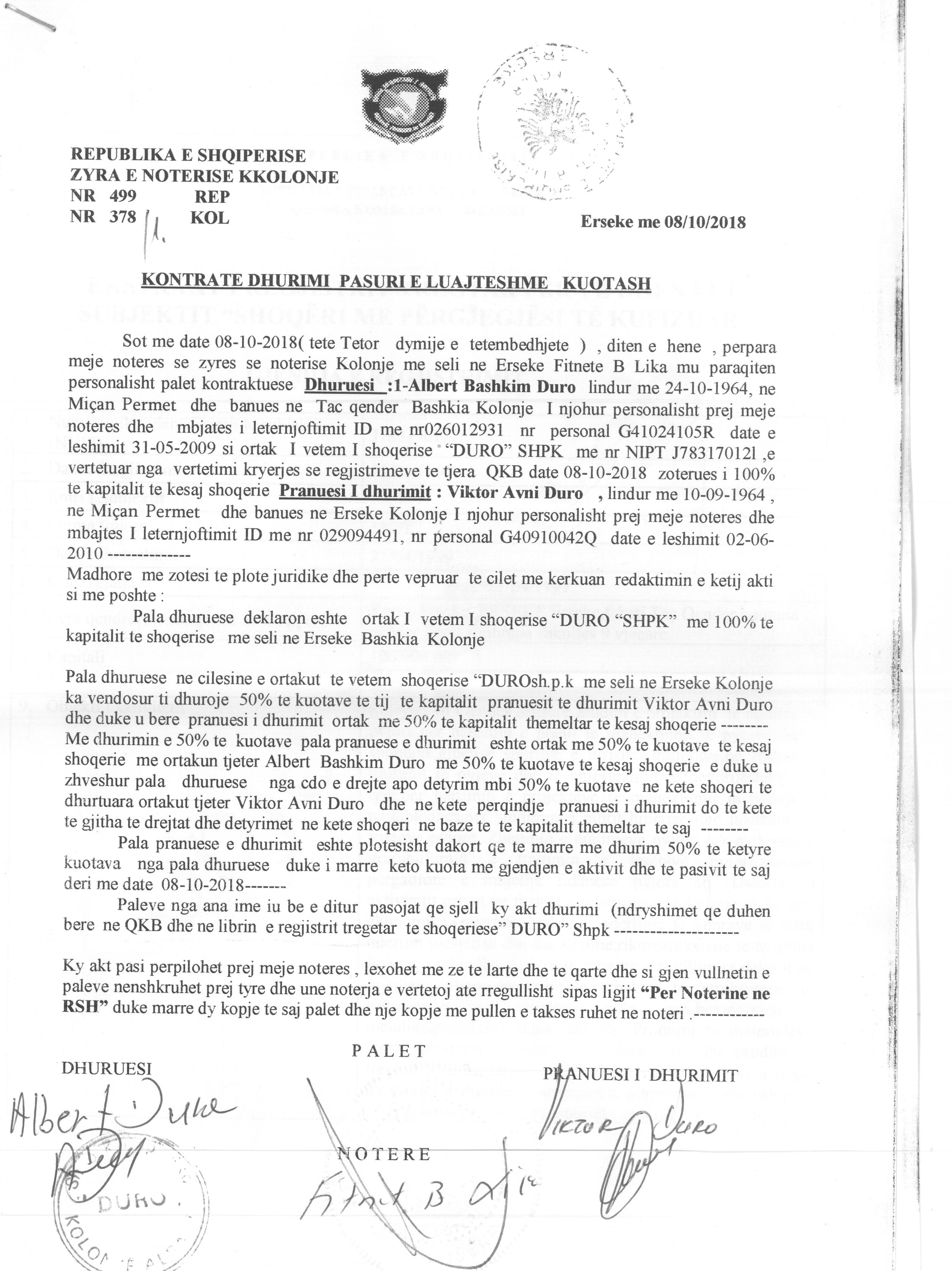 → Ekstrakt historik i regjistrit tregtar 08.02.2021 → Akti i themelimit → Kontrate dhurimi kuotash 08.10.2018 → Kontrate dhurimi kuotash 07.05.2013 |