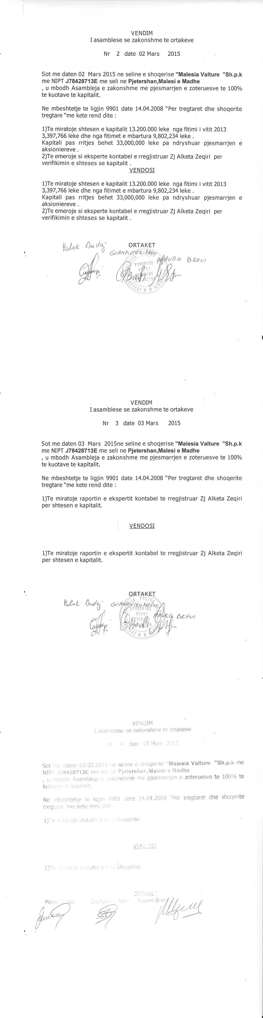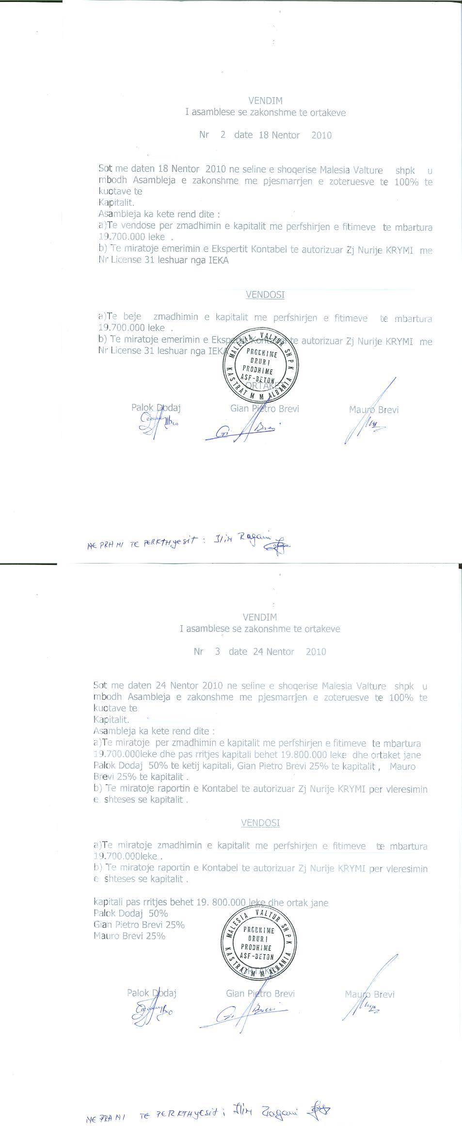 | Çështje Ligjore: | Sipas Urdherit te lëshuar date 13.11.2018, eshte vendosur: masa e sekuestros konservative mbi te gjitha kuotat/aksionet e zoteruara nga subjekti “Malesia Valtur ” shpk. Sipas Urdherit te lëshuar date 03.12.2018, eshte vendosur: zhbllokimi i aksioneve apo kredive te shoqerise Malesia Valtur Shpk. |