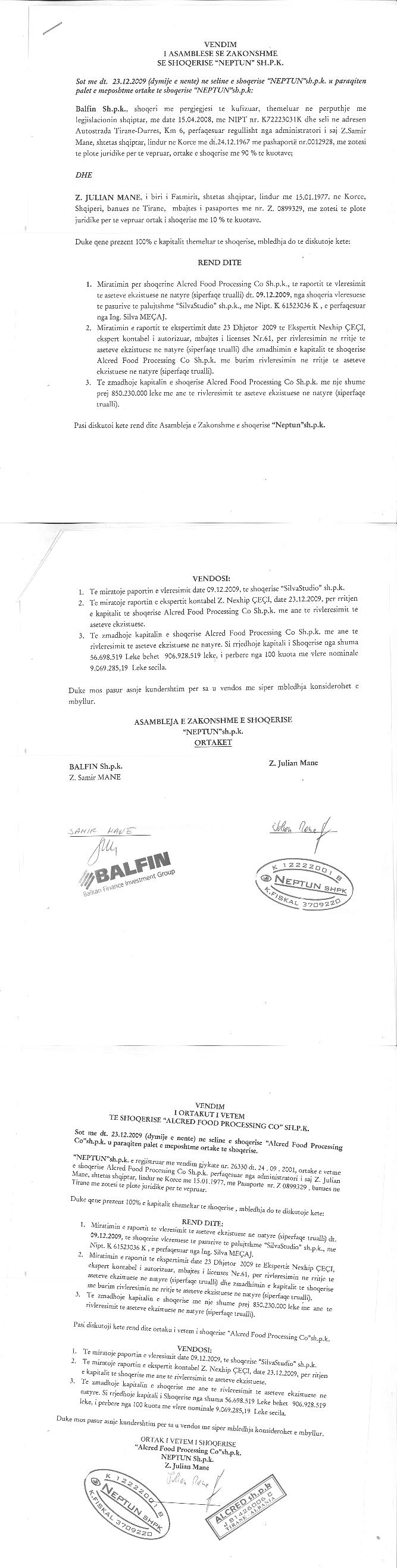 | Shoqëri Mëmë / Zotërues për këtë Subjekt: | “Balfin - Balkan Finance Investment Group”, shoqëri me përgjegjësi te kufizuar e se drejtës shqiptare, e themeluar me datë 11/09/2007, me NIPT K72223031K, me seli qendrore ne Tirane, Njesia bashkiake nr.2, Rruga Papa Gjon Pali II, Ndertesa Nr.12, Kati 11, Zyra nr.1206, Kodi Postar 1010, dhe me administrator Edlira Muka. Ortak i Vetëm i shoqërisë është Samir Mane. (Sipas të dhënave të QKB deri me datë 14.04.2023) Sipas Ekstraktit Historik te Regjistrit te Pronarit Perfitues, date 24.05.2021, terhequr nga QKB date 14.04.2023, Pronar perfitues te subjektit “ALCRED FOOD PROCESSING Co”, zoterues te 25% te kapitalit e me teper eshte: Samir Mane, shtetas shqiptar, i datelindjes 1967, pronar perfitues prej 100% te kapitalit, pasi zotëron 100% të kapitali të shoqërisë “Balfin - Balkan Finance Investment Group”, e cila zotëron 100% të kapitalit të “ALCRED FOOD PROCESSING Co”. Data e percaktimit si pronar perfitues eshte 01.11.2011. |