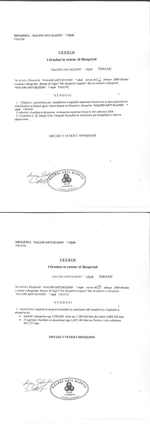→ Ekstrakt Historik i Regjistrit Tregtar date 05.06.2023 → Akt themelimi dhe Statuti i Shoqerise → Vendim i Ortakut te Vetem, Zmadhim Kapitali date 15.06.2006 → Vendim i Ortakut te Vetem, Zmadhim Kapitali date 07.02.2010 → Vendim i Ortakut te Vetem, Zmadhim Kapitali date 14.06.2012 → Vendim i Ortakut te Vetem, Zmadhim Kapitali date 29.06.2016 → Vendim i Ortakut te Vetem, Zmadhim Kapitali date 29.06.2017 → Vendim i Ortakut te Vetem, Zmadhim Kapitali date 27.06.2018 |
