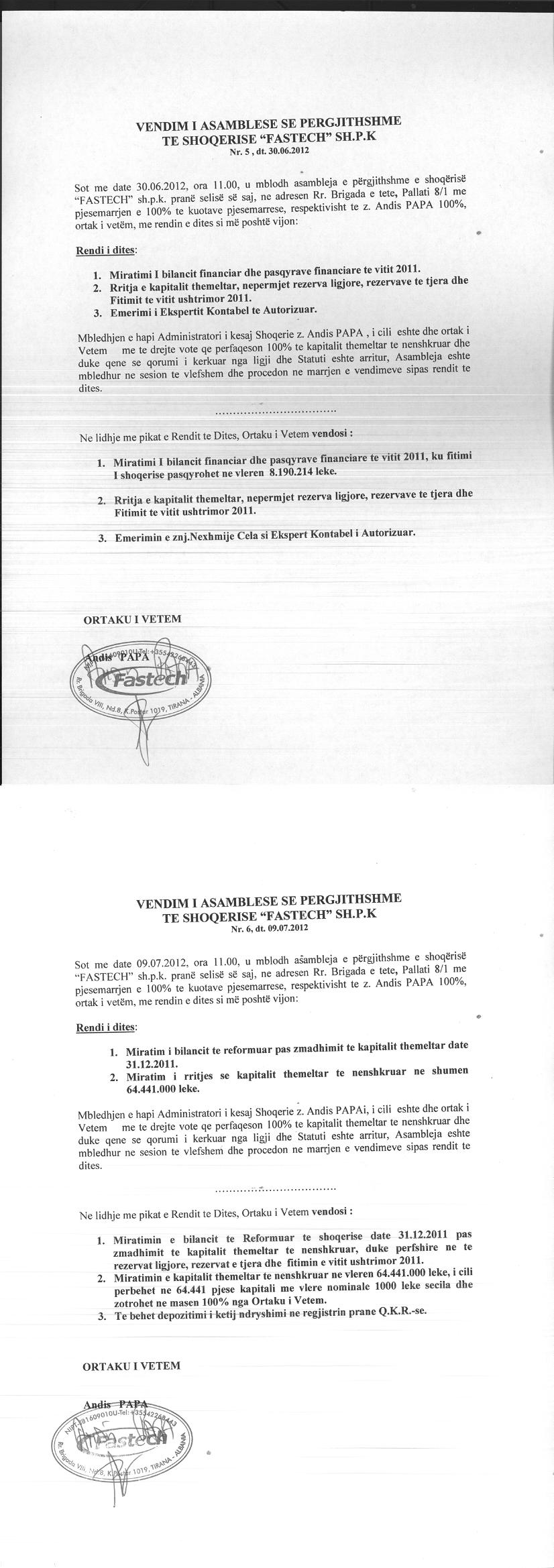 Vendim i asamblese se ortakeve per rritjen e kapitalit date 30.06.2012