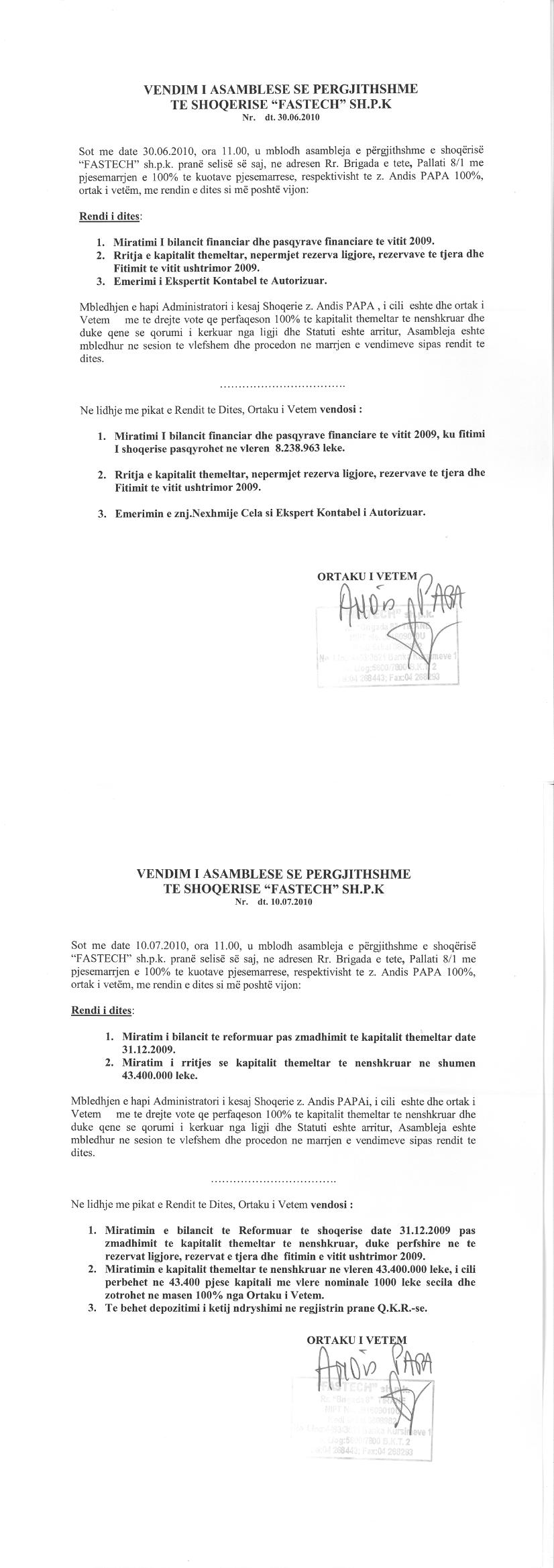 Vendim i asamblese se ortakeve per rritjen e kapitalit date 30.06.2010