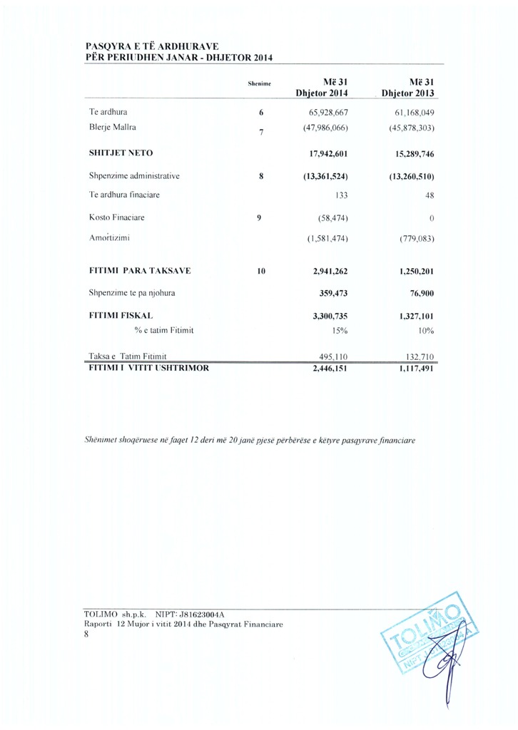 2 751 361,00 Fitimi para Tatimit(Lekë) 2019: 2 495 007,00 Fitimi para Tatimit(Lekë) 2018: 114 598,00 Fitimi para Tatimit(Lekë) 2017: 234 518,00 Fitimi para Tatimit(Lekë) 2016: 1 604 710,00 Fitimi para Tatimit(Lekë) 2015: -453 808,00 Fitimi para Tatimit(Lekë) 2014: 2 941 262,00 Fitimi para Tatimit(Lekë) 2013: 1 250 201,00 Fitimi para Tatimit(Lekë) 2012: 1 483 043,00 |