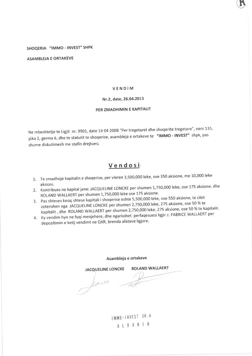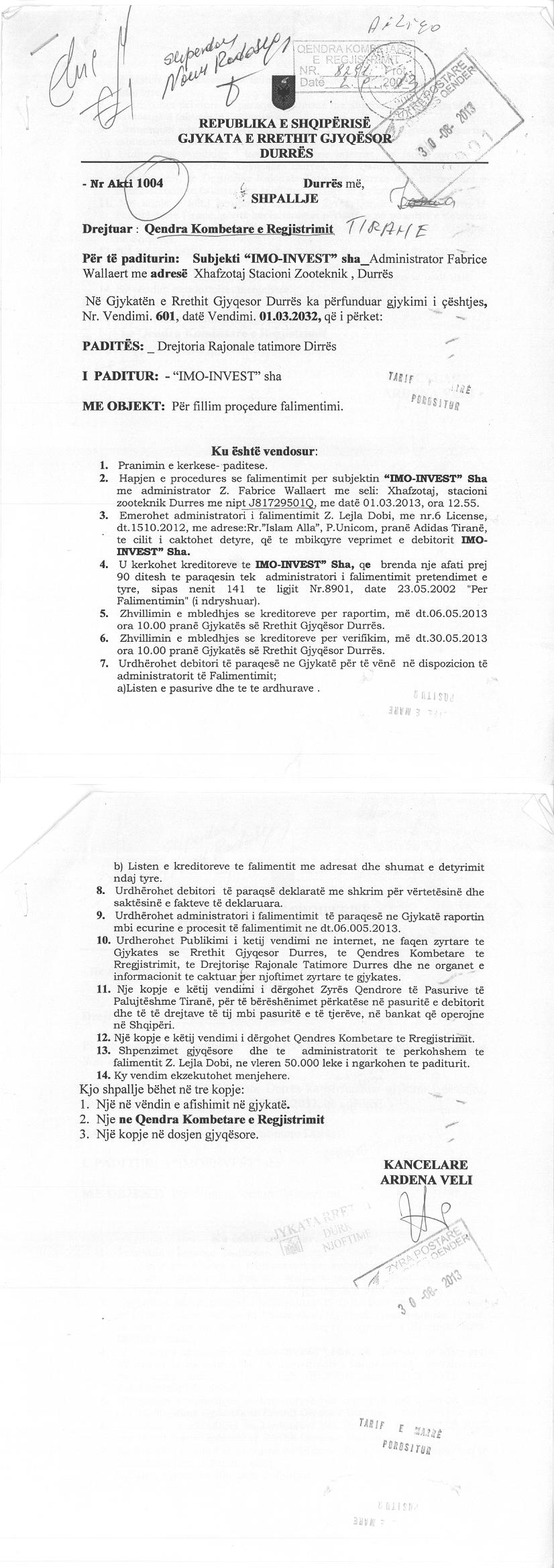 01.03.2013, që i përket: Paditës: Drejtoria Rajonale Tatimore Durrës. I Paditur: “IMO – INVEST” sh.a. Me objekt: Për fillim procedure falimentimi. Ku ndër të tjera është vendosur: 1. Pranimi i kërkesë-padisë. 2. Hapjen e proçedurës së falimentimit për subjektin “IMO – INVEST” sh.a., me administrator Fabrice Wallaert, me seli: Xhafzotaj, stacioni zooteknik, Durrës, me NIPT-J81729501Q, me datë 01.03.2013, ora 12.55. 3.Emërohet administratori i falimentit Z. Lejla Dobi, me Nr. 6 Licence, datë:15.10.2012, me adresë: Rr. “Islam Alla”, P. Unicom, pranë Adidas, Tiranë, të cilit i caktohet detyrë, që të mbikqyrë veprimet e debitorit “IMO-INVEST” sh.a. Statusi i shoqërisë ishte "Aktiv" u be "Shoqëri në procedurë falimenti". II. Me datë 30.07.2013, me Vendimit te Gjykates se Rrethit Gjyqesor Durres Nr. Regj. Them.(90103-02935) 164, date 24.07.2013, Nr.164 Vendimi (11-2013-4034), date 30.07.2013, u vendos: Pranimin e kerkeses. Nderprerjen e procedures se falimentit per subjektin "IMO-INVEST" Sha me administrator Z. Fabrice Wallaer, per shkak te zhdukjes se shkakut per hapjen e procedures se falimentimit. Urdherohet çregjistrimi i vendimit per hapjen e procedures se falimentimit Nr.601, date 01.03.2013 te Gjykates se Rrethit Gjyqesor Durres, ne Rregjistrin e pasurive te palujteshme Durres, duke bere çregjistrimet perkatese. a) mbi çdo pasuri te palujteshme ku debitori eshte regjistruar si pronar; b) mbi te drejtat e tjera te regjistruara te debitorit mbi pasuri te luajteshme ose te drejta te tjera te regjistruara. Statusi i shoqërisë ishte "Shoqëri në procedurë falimenti" u be "Aktiv". |