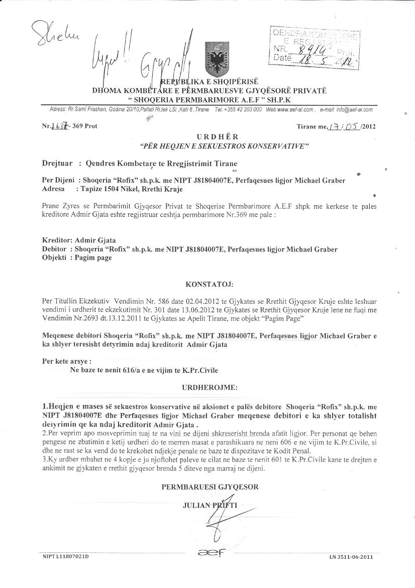 kuotat e shoqerise "ROFIX", me NUIS J81804007E. II. Me datë 17.05.2012, me anë Urdhrit Nr. 2637-369 Prot., leshuar nga shoqeria permbarimore "A.E.F" sh.p.k, u urdhërua: heqja e mases se sekuestros konservative ne aksionet e pales debitore shoqeria "ROFIX" sh.p.k me NUIS (NIPT) - J81804007E me perfaqesues ligjor Michael Graber, meqenese debitori ka shlyer totalisht detyrimin qe ka ndaj kreditorit Admir Gjata. III. Me datë 11.09.2013, me anë të Urdhrit Nr.2346 Prot, Për Vënien e Sekuestros Konservative,lëshuar nga Shoqëria Përmbarimore “PETANI BAILIFF’S OFFICE”, u urdhërua: Vendosja e sekuestros konservtive mbi aksionet që zotëron debitori ,subjekt juridik,”ROFIX” shpk,Znj.Aurora Gjinollari me NIPT J81804007E me qëllim mostjetërsimin e tyre për tu shmangur nga detyrimi për ekzekutimin e Urdhërit të Ekzekutimit Nr.10344 datë 08.11.2012 të Gjykatës së Rrethit Gjyqësor Tiranë. IV. Me datë 25.09.2013, me anë të Urdherit Nr.2754 Prot, lëshuar nga Shoqeria Permbarimore “PETANI BAILIFF’S OFFICE”sh.p.k, u urdhërua: Heqja e mases se sekuestros konservative mbi aksionet qe zoteron debitori subjekt juridik " ROFIX " sh.p.k, Znj.Aurora Gjinollari, me Nr. NIPTI J81804007E, per shkak te Ekzekutimit te Urdherit te Ekzekutimit Nr.10344, Date 08.11.2012, te Gjykates se Rrethit Gjyqesor Tirane. |