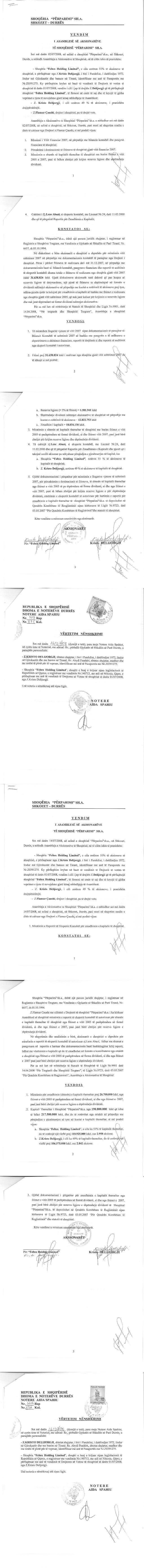 → Ekstrakt Historik i Regjistrit Tregtar date 31.05.2024 → Akt themelimi dhe Statuti i Shoqerise → Dokumente të Ndryshme → Kontratë Dhurimi datë 07.12.1999 → Kontratë Shitje datë 17.03.2000 → Kontratë Shit-blerje Kuotash datë 03.03.2006 → Akt themelimi dhe Statuti i Shoqërisë së Huaj "Feltex Holdings Limited" → Vendim i Asamblesë së Jashtëzakonshme të Aksionarëve, Zmadhim Kapitali datë 14.01.2005 → Vendim i Asamblesë së Jashtëzakonshme të Aksionarëve, Zmadhim Kapitali datë 25.07.2005 → Vendim i Asamblesë së Aksionarëve, Zmadhim Kapitali datë 02.07.2008 → Raport për Vlerësimin e Zmadhimit të Kapitalit në Zbatim të Vendimit për Zmadhimin e Kapitalit datë 02.07.2008 → Vendim i Asamblesë së Aksionarëve, Zmadhim Kapitali datë 29.06.2009 → Vendim i Asamblesë së Aksionarëve, Zmadhim Kapitali datë 29.06.2010 → Vendim i Asamblesë së Aksionarëve, Zmadhim Kapitali datë 31.07.2012 → Vendim i Asamblesë së Aksionarëve, Zmadhim Kapitali datë 12.07.2013 → Vendim i Asamblesë së Aksionarëve, Zmadhim Kapitali datë 21.04.2014 → Vendim i Asamblesë së Aksionarëve, Zmadhim Kapitali datë 22.06.2015 → Vendim i Asamblesë së Aksionarëve, Zmadhim Kapitali datë 20.06.2016 → Vendim i Asamblesë së Aksionarëve, Zmadhim Kapitali datë 08.06.2017 → Vendim i Asamblesë së Aksionarëve, Zmadhim Kapitali datë 17.06.2018 → Vendim i Asamblesë së Aksionarëve, Zmadhim Kapitali datë 24.06.2019 → Vendim i Asamblesë së Aksionarëve, Zmadhim Kapitali datë 19.06.2020 → Kontratë Shitje Kuotash datë 10.01.2024 → Akt themelimi dhe Statuti i Shoqërisë së Huaj "Michripa Ltd" → Ekstrakt Historik i Regjistrit te Pronareve Perfitues date 31.05.2024 → Ekstrakt Historik i Regjistrit Tregtar date 06.12.2024 |