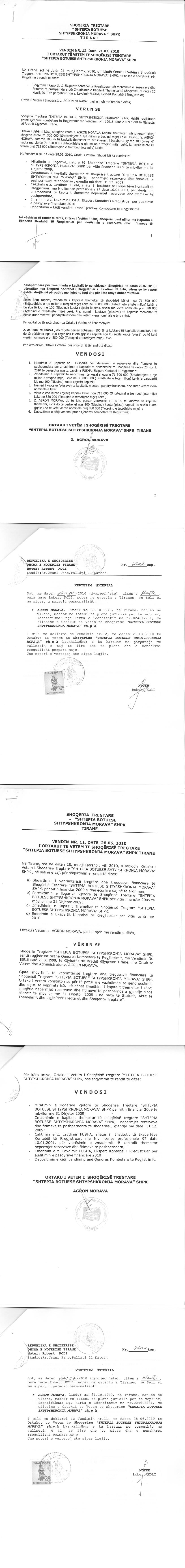 → Ektrakti Historik i Regjistrit Tregtar date 14.07.2022 → Akt themelimi dhe Statuti i Shoqerise → Vendim i Ortakut te Vetem, Zmadhim Kapitali date 25.06.2003 → Vendim i Ortakut te Vetem, Zmadhim Kapitali date 09.07.2005 → Vendim i Ortakut te Vetem, Zmadhim Kapitali date 21.07.2010 → Vendim i Ortakut te Vetem, Zmadhim Kapitali date 30.06.2013 |