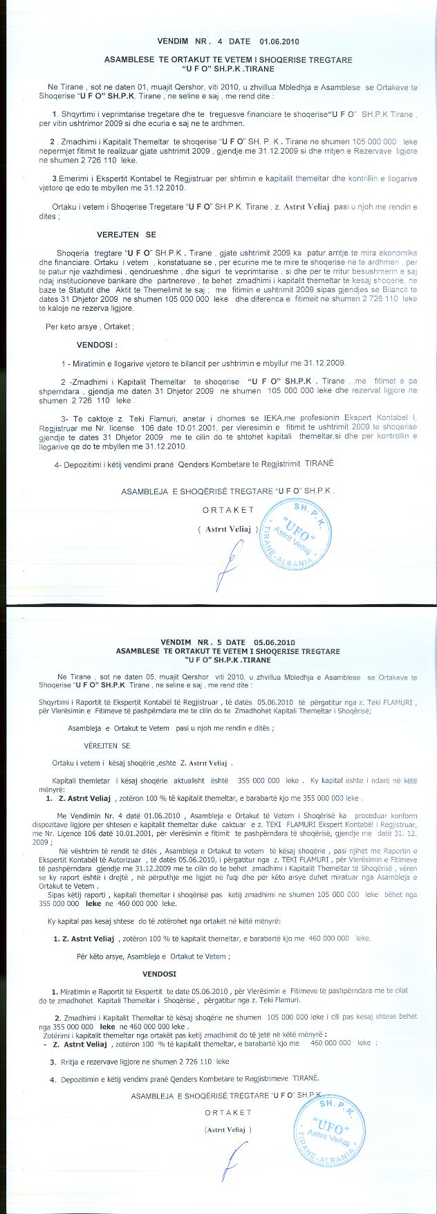 → Ekstrakt Historik i Regjistrit Tregtar date 24.06.2022 → Vendim i Ortakut te Vetem, Zmadhim Kapitali date 20.10.2009 → Vendim i Ortakut te Vetem, Zmadhim Kapitali date 05.06.2010 → Statusi i Shoqerise date 28.07.2016 |