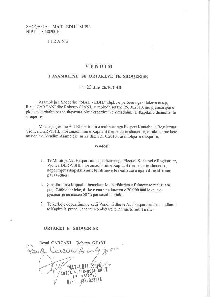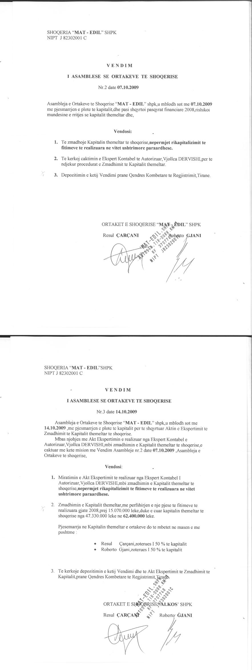 → Ekstrakt Historik i Regjistrit Tregtar date 11.06.2024 → Akt themelimi dhe Statuti i Shoqerise → Dokumente të Ndryshme → Kontratë Shitblerje datë 03.05.2000 → Vendim të Ortakut të Vetëm, Bashkimi i shoqërive "Dian - Tir" shpk dhe "Mat - Edil" shpk datë 15.12.2002 → Projekt Bashkimi me Përthithje midis Shoqërive "Dian - Tir" shpk dhe "Mat - Edil" shpk datë 15.12.2005 → Vendim i Asamblesë së Ortakëve, Zmadhim Kapitali datë 18.07.2005 → Vendim i Asamblesë së Ortakëve, Zmadhim Kapitali datë 22.07.2007 → Akt Ekspertimi për Zmadhimin e Kapitalit datë 22.07.2007 → Vendim i Asamblesë së Ortakëve, Zmadhim Kapitali datë 14.10.2009 → Vendim i Asamblesë së Ortakëve, Zmadhim Kapitali datë 26.10.2010 → Vendim i Asamblesë së Ortakëve, Zmadhim Kapitali datë 26.09.2012 → Vendim i Asamblesë së Ortakëve, Zmadhim Kapitali datë 04.09.2015 → Vendim i Asambles së Ortakëve, Zmadhim Kapitali datë 01.06.2017 → Dëshmi e trashëgimisë Ligjore për trashëgimlënësin Roberto Gjani datë 12.06.2018 → Kontratë Shitblerje Kuotash Kapitali datë 23.06.2018 → Kontratë Shitblerje Kuotash Kapitali datë 25.06.2018 → Kontratë Shitblerje Kuotash Kapitali datë 26.06.2018 → Kontratë Shitblerje Kuotash Kapitali datë 26.06.2018 (1) → Kontratë Shitblerje Kuotash Kapitali datë 04.07.2018 → Kontratë Shitblerje Kuotash Kapitali datë 20.07.2018 → Kontratë Shitblerje Kuotash Kapitali datë 24.07.2018 → Kontratë Shitblerje Kuotash Kapitali datë 31.07.2018 → Kontratë Shitblerje Kuotash Kapitali datë 06.11.2018 → Vendim i Asamblesë së Ortakut të Vetëm, Zvogëlim Kapitali datë 12.11.2018 → Vendim i Ortakut të Vetëm, Zmadhim Kapitali datë 24.09.2020 → Vendim i Ortakut të Vetëm, Zvogëlim Kapitali datë 24.12.2021 |