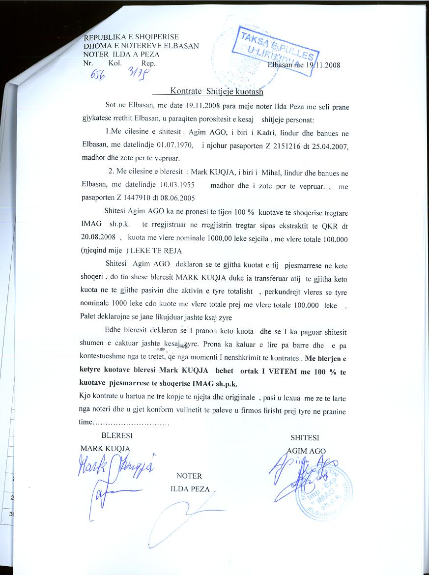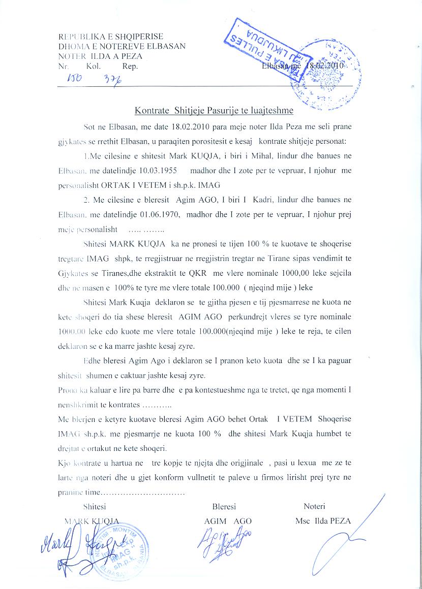 → Ekstrakt historik i regjistrit tregtar date 02.09.2021 → Statuti dhe akti i themelimit → Kontrate shitje pasuri e palujtshme date 18.02.2010 → Kontrate shitje kuotash date 19.11.2008 → Ekstrakt historik i regjistrit tregtar date 02.08.2025 |
