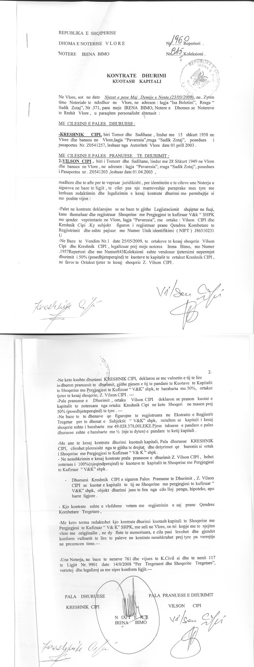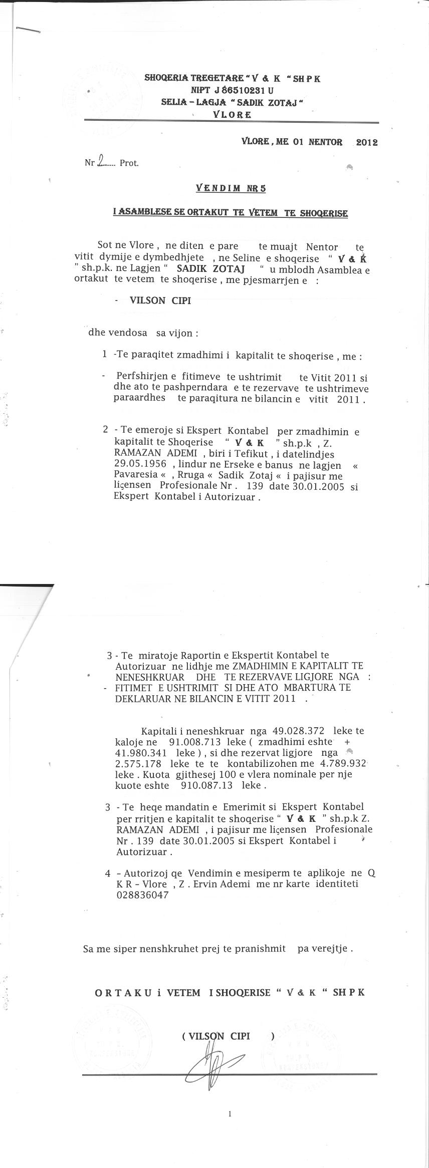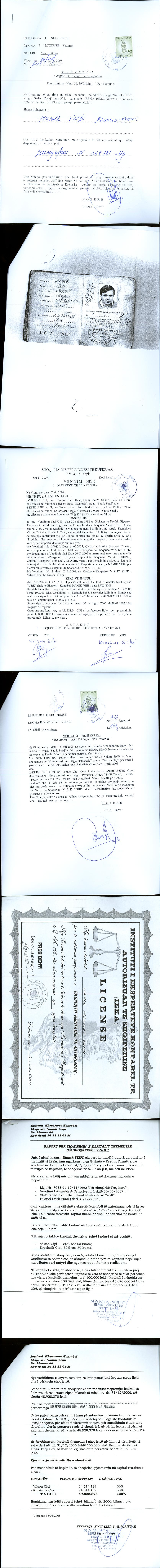→ Ekstrakti Historik i Regjistrit Tregtar date 13.07.2022 → Akt themelimi dhe Statuti i Shoqerise → Vendim i Asamblese se Ortakeve, Zmadhim Kapitali date 02.04.2008 → Kontrate Dhurimi Kuotash date 25.05.2009 → Vendim i Ortakut te Vetem, Zmadhim Kapitali date 01.11.2012 → Vendim i Ortakut te Vetem, Likuidim i Shoqerise date 25.11.2014 |