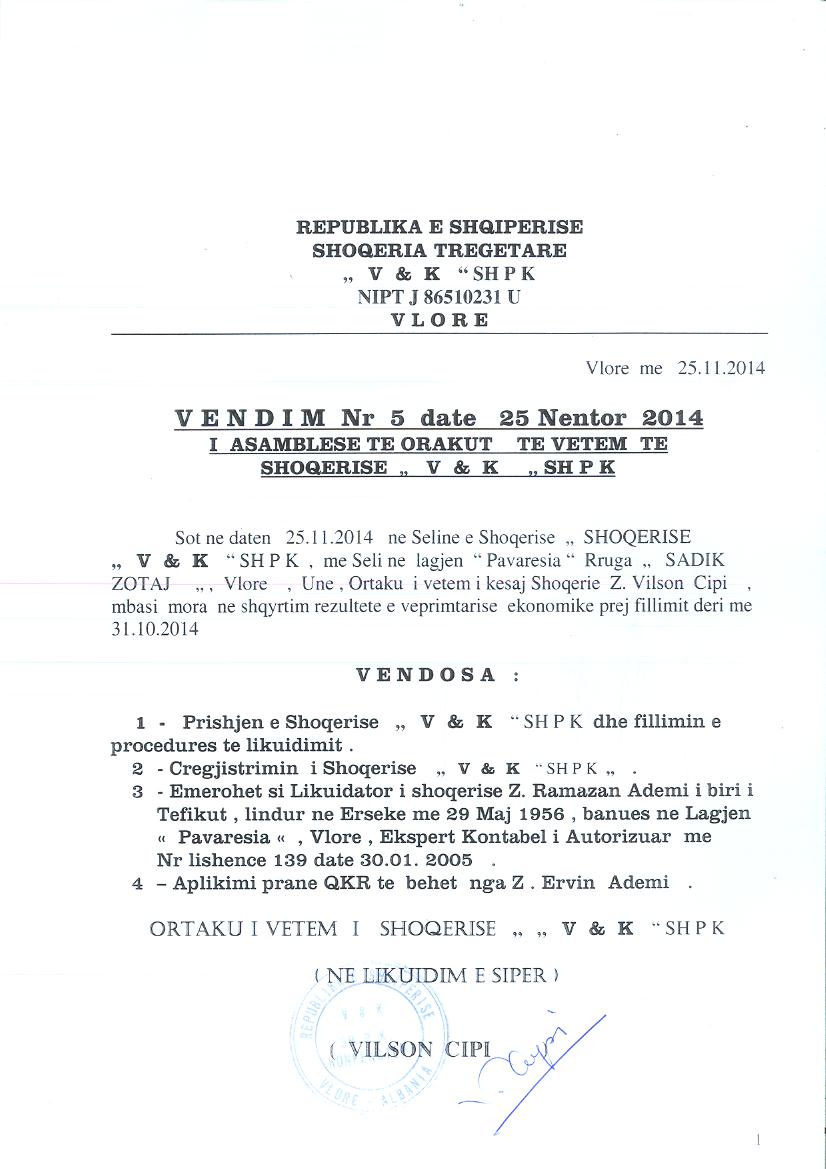 | Çështje Ligjore: | Me date 25.11.2014, me vendim te ortakut te vetem, u vendos: Likujdimi i Shoqerise. Statusi i Shoqerise kalon nga "Aktiv" ne "Shoqeri ne Likuidim e Siper" |
