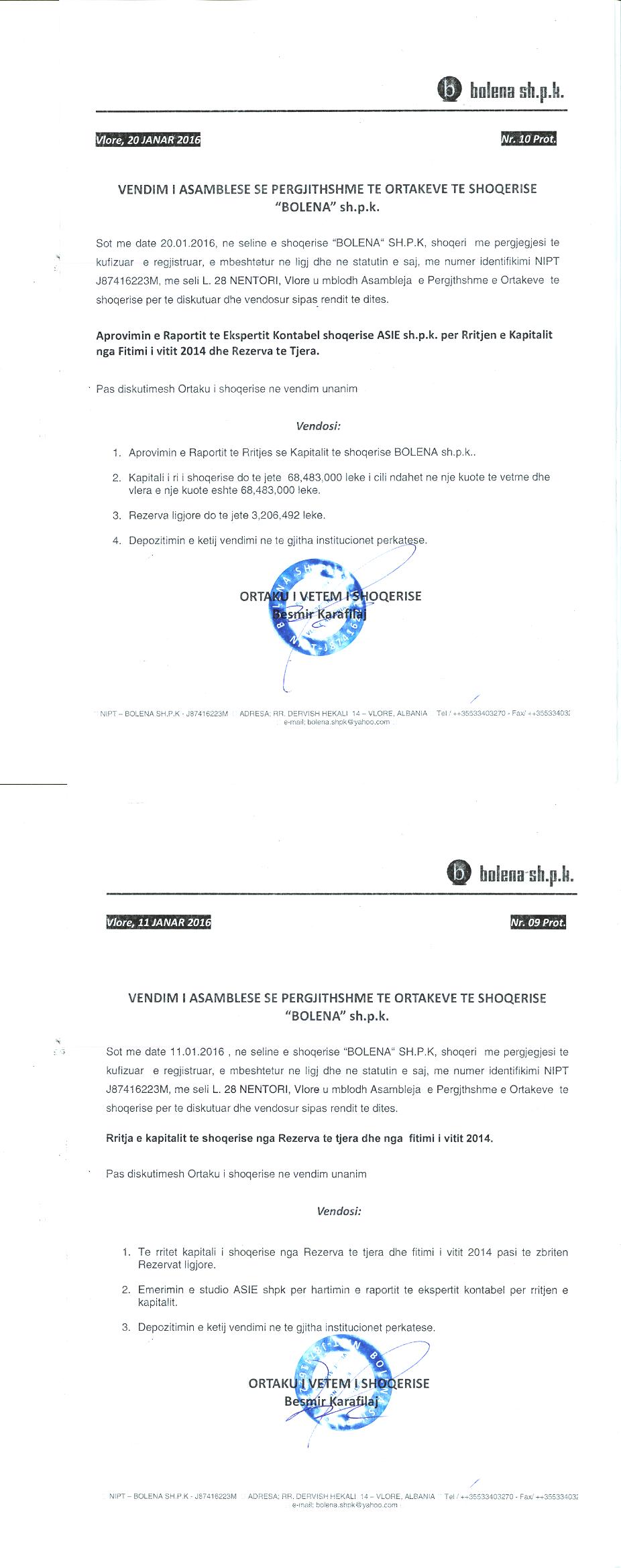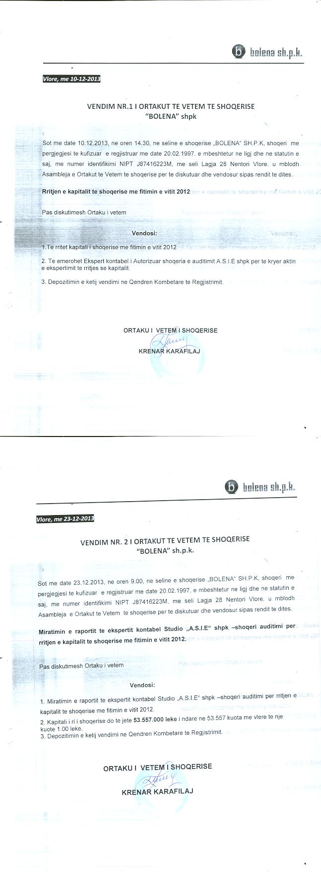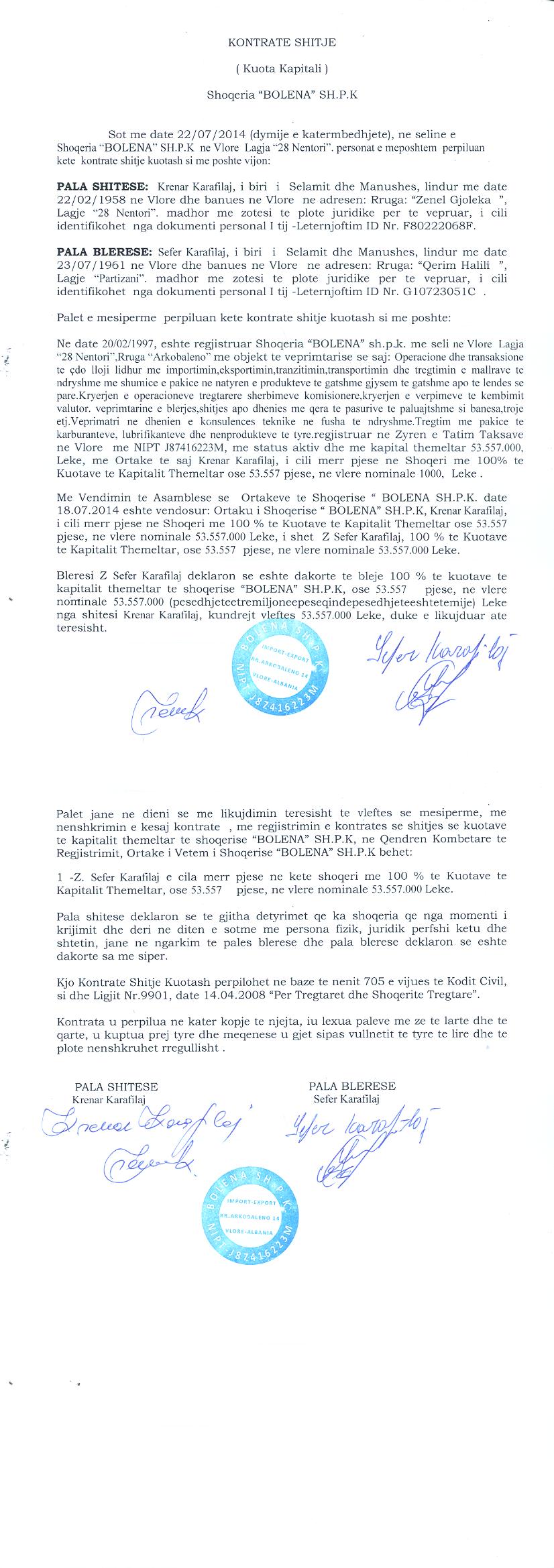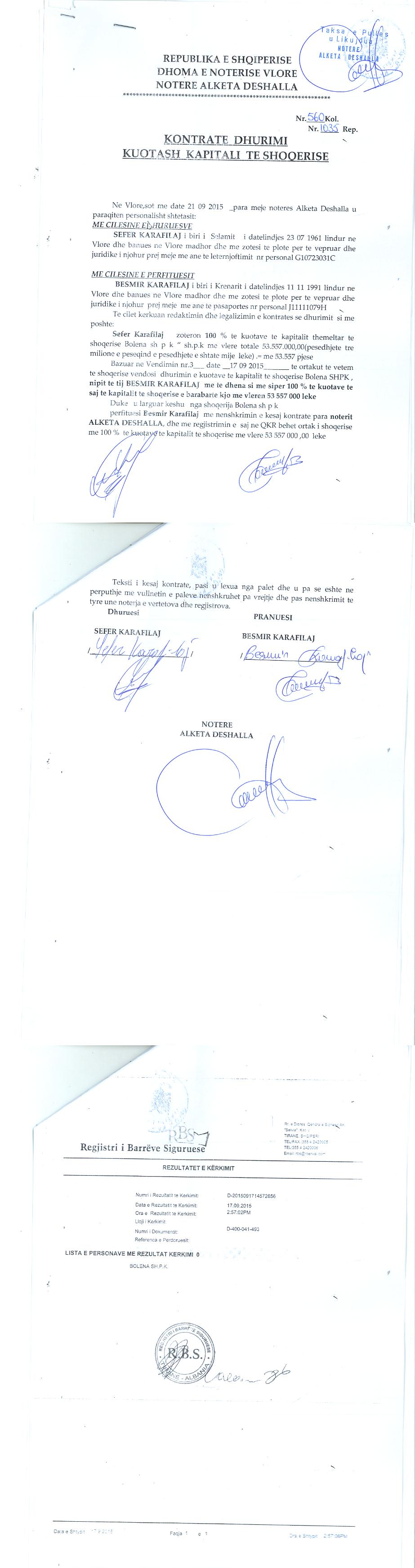 → Ekstrakt historik i regjistrit tregtar 10.02.2021 → Akti i themelimit → Kontrate dhurimi kuotash kapitali 21.09.2015 → Kontrate shitje kuotash kapitali 10.02.2021 → Vendim i ortakut te vetem per rritjen e kapitalit 10.12.2013 → Vendim i asamblese se ortakeve per aprovimin e raportit te rritjes se kapitalit 20.01.2016 |