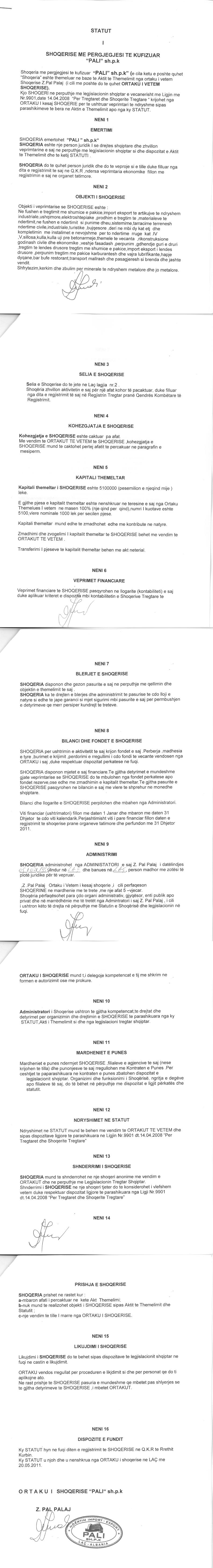 | Çështje Ligjore: | I.Sipas Urdherit te lëshuar date 06.08.2012, eshte vendosur: masa e sekuestros konservative ne aktivet e pales debitore shoqeria “Pali” shpk me NIPT J87605302Q. II. Sipas Urdherit te lëshuar date 08.11.2016, eshte vendosur: masa e sekuestros konservative ne aktivet e pales debitore shoqeria “Pali” shpk me NIPT J87605302Q. III. Sipas Urdherit te lëshuar date 11.11.2016, eshte vendosur: heqja e sekuestros mbi subjektin: PALI sh.p.k, me NIPT J87605302Q. |