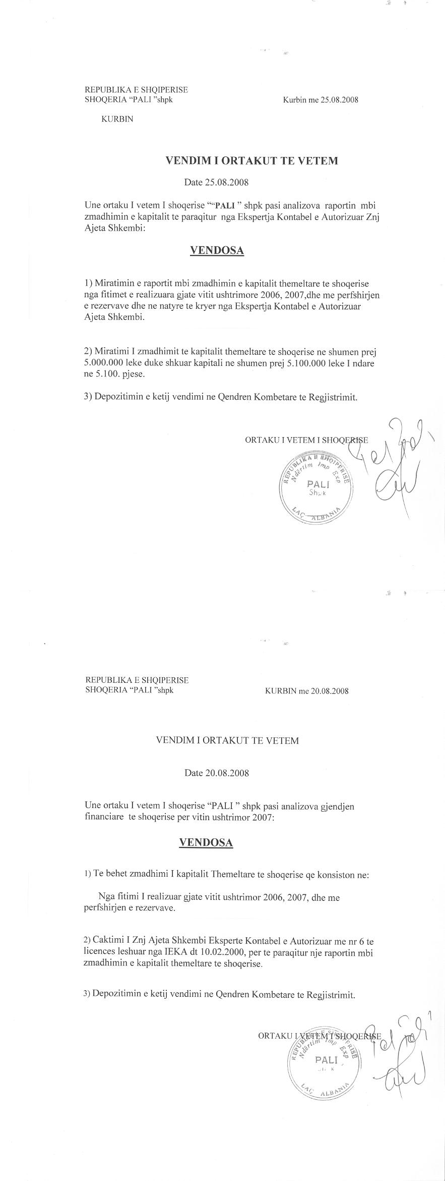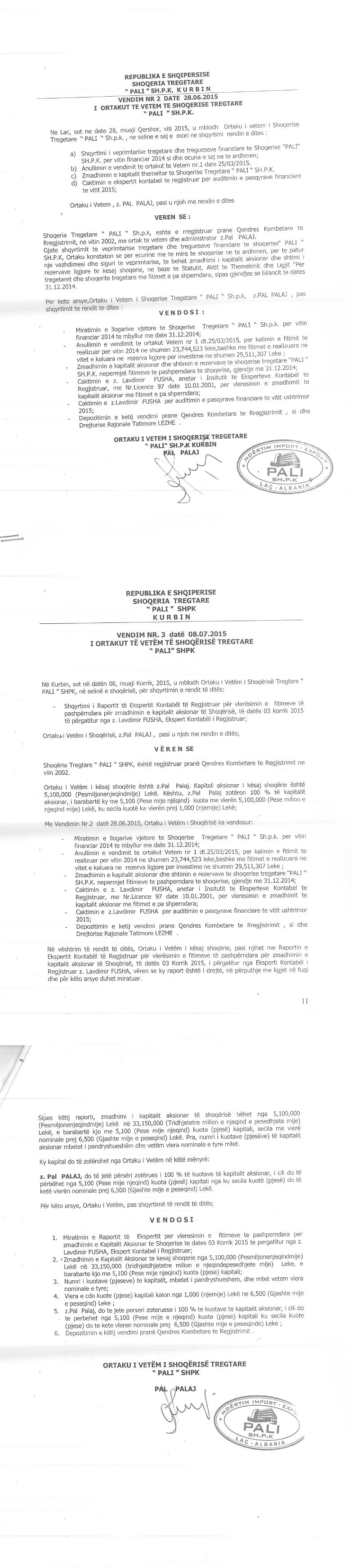→ Ekstrakti Historik i Regjistrit Tregtar date 10.11.2021 → Statuti i Shoqerise → Kontrate e Shitjes se Kuotave date 17.01.2000 → Vendim i Asamblese se Pergjithshme per rritjen e kapitalit date 25.08.2008 → Vendim i Asamblese se Pergjithshme per rritjen e kapitalit date 28.06.2015 |