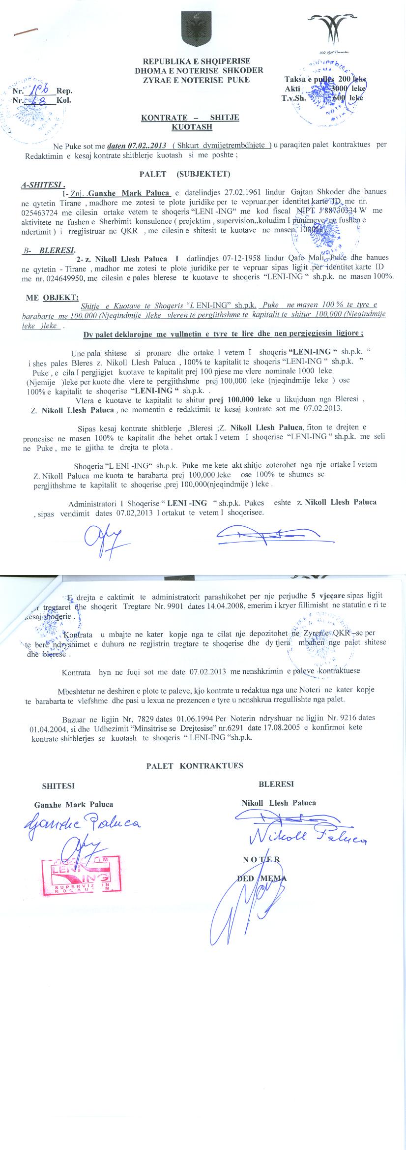 → Ekstrakt historik i regjistrit tregtar date 27.07.2021 → Kontrate shitje kuotash date 07.02.2013 → Ekstrakti Historik i Regjistrit Tregtar date 09.05.2023 |