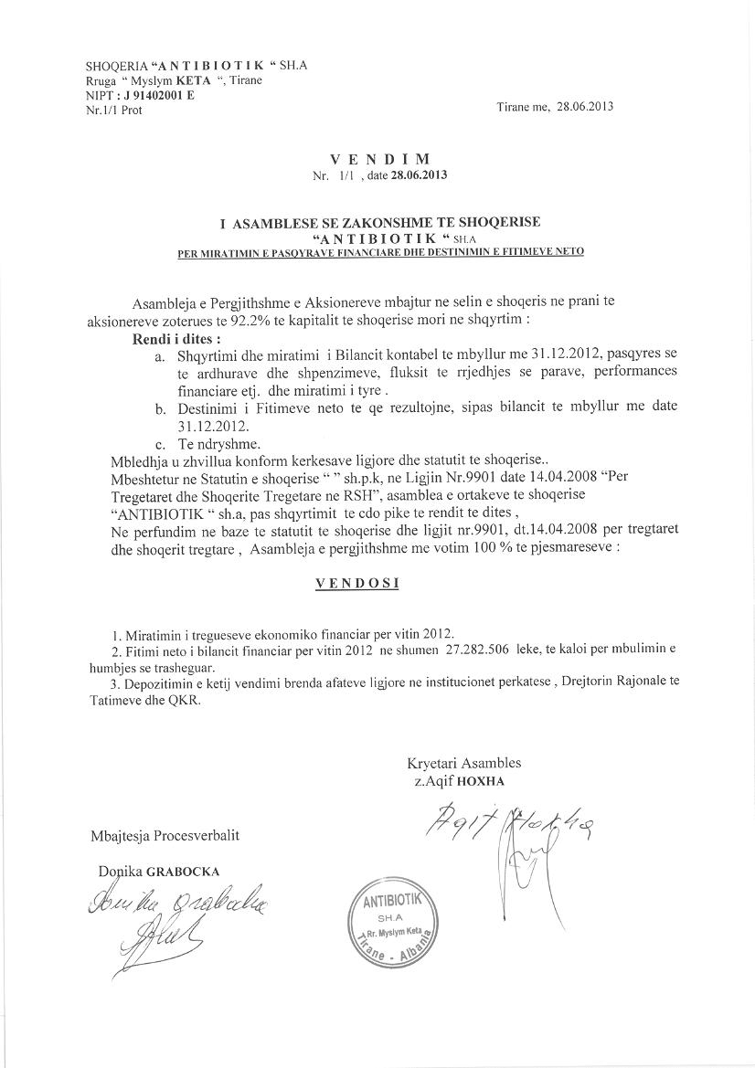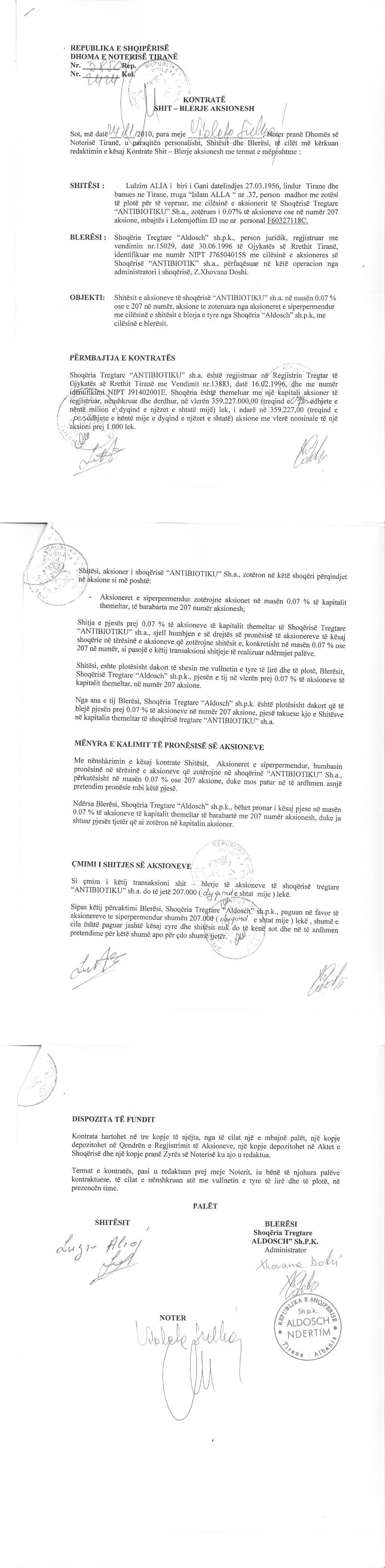 → Ekstrakti Historik i Regjistrit Tregtar date 18.05.2023 → Akt themelimi dhe Statuti i Shoqerise → Urdher per Shnderrimin e Formes Ligjore date 19.01.1996 → Vendim i Gjyqtarit te Vetem, Zmadhim Kapitali date 14.03.1996 → Vendim i Gjyqtarit te Vetem, (Privatizimi) Shitja e Aksioneve date 25.10.1996 → Raporti i Aksioneve pas Privatizimit → Kontrate Dhurimi Aksionesh date 18.05.2006 → Ekstrakti i Regjistrit te Aksioneve, QRA date 03.03.2008 (272 Aksionere) → Ekstrakti i Regjistrit te Aksioneve, QRA date 23.07.2008 → Kontrate Shitblerje Aksionesh ndermjet Aksionereve te vegjel dhe Shoqerise "ALDOSCH" → Kontrate Shitblerje Aksionesh ndermjet Aksionereve te vegjel dhe Shoqerise "ALDOSCH" → Ekstrakti i Regjistrit te Aksioneve, QRA date 13.10.2008 → Kontrate Shitblerje Aksionesh ndermjet Aksionereve te vegjel dhe Shoqerise "ALDOSCH" → Kontrate Shitblerje Aksionesh ndermjet Aksionereve te vegjel dhe Shoqerise "ALDOSCH" → Konfirmim Llogarie date 05.02.2009 → Kontrate Shitblerje Aksionesh ndermjet Aksionereve te vegjel dhe Shoqerise "ALDOSCH" → Kontrate Shitblerje Aksionesh ndermjet Aksionereve te vegjel dhe Shoqerise "ALDOSCH" → Kontrate Shitblerje Aksionesh ndermjet Aksionereve te vegjel dhe Shoqerise "ALDOSCH" → Kontrate Shitblerje Aksionesh ndermjet Aksionereve te vegjel dhe Shoqerise "ALDOSCH" → Kontrate Shitblerje Aksionesh ndermjet Aksionereve te vegjel dhe Shoqerise "ALDOSCH" → Kontrate Shitblerje Aksionesh ndermjet Aksionereve te vegjel dhe Shoqerise "ALDOSCH" → Kontrate Shitblerje Aksionesh ndermjet Aksionereve te vegjel dhe Shoqerise "ALDOSCH" → Kontrate Shitblerje Aksionesh ndermjet Aksionereve te vegjel dhe Shoqerise "ALDOSCH" → Vendim, Leshimi i Deshmise se Trashegimise date 20.09.2002 → Kontrate Shitblerje Aksionesh ndermjet Aksionereve te vegjel dhe Shoqerise "ALDOSCH" → Kontrate Shitblerje Aksionesh ndermjet Aksionereve te vegjel dhe Shoqerise "ALDOSCH" → Kontrate Shitblerje Aksionesh ndermjet Aksionereve te vegjel dhe Shoqerise "ALDOSCH" → Kontrate Shitblerje Aksionesh ndermjet Aksionereve te vegjel dhe Shoqerise "ALDOSCH" → Kontrate Shitblerje Aksionesh ndermjet Aksionereve te vegjel dhe Shoqerise "ALDOSCH" → Kontrate Shitblerje Aksionesh ndermjet Aksionereve te vegjel dhe Shoqerise "ALDOSCH" → Kontrate Shitblerje Aksionesh ndermjet Aksionereve te vegjel dhe Shoqerise "ALDOSCH" → Kontrate Shitblerje Aksionesh ndermjet Aksionereve te vegjel dhe Shoqerise "ALDOSCH" → Vendim i Aksionerit te Vetem, Shitblerje Aksionesh → Lista e Aksionereve deri date 13.12.2012 → Vendim i Asamblese se Aksionereve date 28.06.2013 → Ekstrakti i Regjistrit te Aksioneve, QRA date 25.02.2016 → Marreveshje Siguruese date 14.11.2016 → Marreveshje Siguruese date 02.02.2017 → Marreveshje Siguruese date 09.03.2017 → Lista e Aksionereve deri date 31.12.2017 → Lista e Aksionereve deri date 31.12.2019 → Ekstrakti Historik i Regjistrit te Pronareve Perfitues date 18.05.2023 → Ekstrakt Historik i Regjistrit Tregtar date 28.07.2023 → Ekstrakt Historik i Regjistrit te Pronareve Perfitues date 28.07.2023 → Ekstrakt Historik i Regjistrit Tregtar date 05.04.2025 |