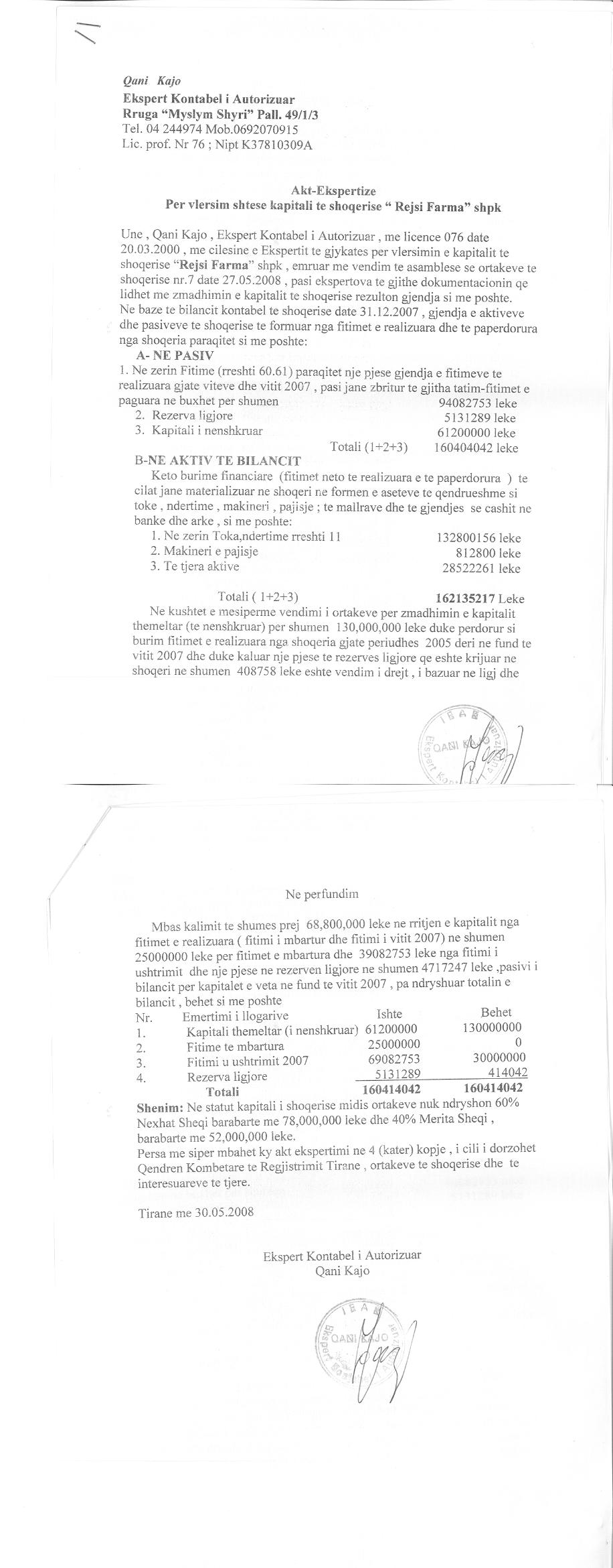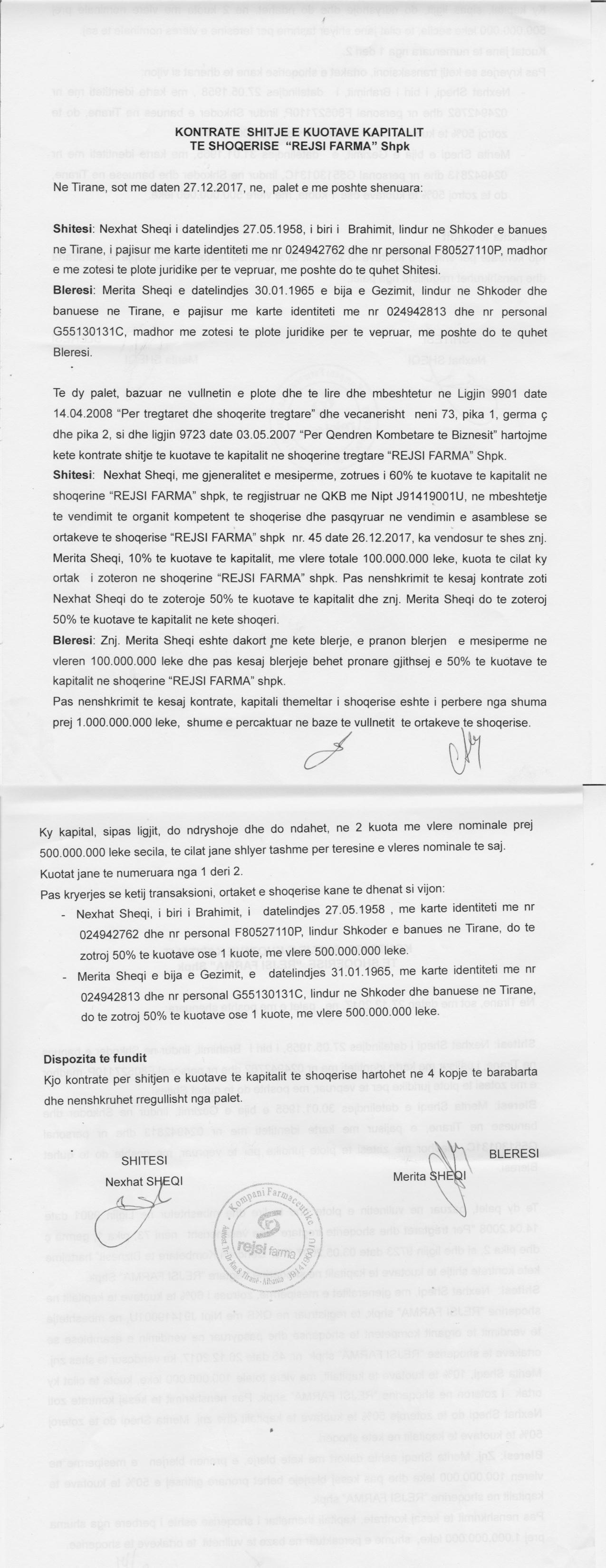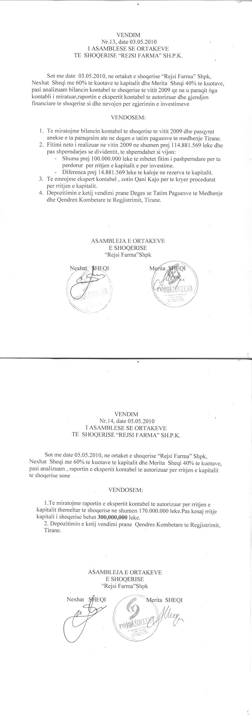 → Ekstrakt historik i regjistrit tregtar 20.10.2023 → Akti i themelimit dhe statuti i shoqerise → Akt ekspertize per vleresim kapitali 20.03.2000 → Kontrate shitje kuotash kapitali 27.05.2003 → Kontrate shitblerje 30.11.2001 → Kontrate shitje e kuotave te kapitalit 27.12.2017 → Vendimi i asamblese se ortakeve 25.07.2013 → Vendimi i asamblese se ortakeve per rritjen e kapitalit 03.05.2010 → Ekstrakt Historik i Regjistrit Tregtar date 24.04.2024 |
