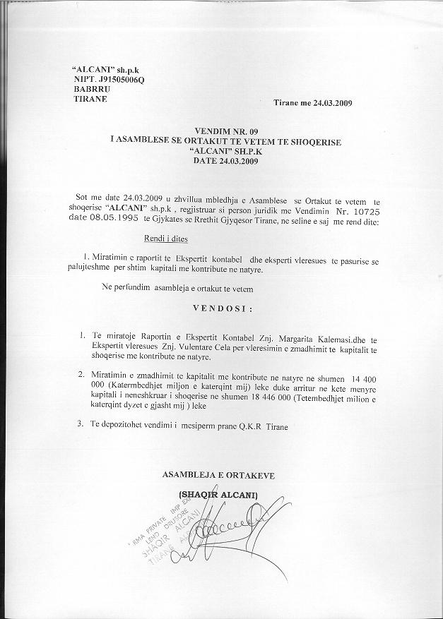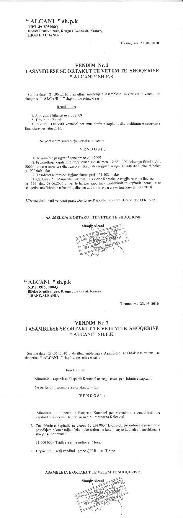 → Ekstrakt historik i regjistrit tregtar 21.10.2021 → Akti i themelimit → Vendim i asamblese se ortakut te vetem per zmadhimin e kapitalit 21.06.2010 → Vendim i asamblese se ortakut te vetem per zmadhimin e kapitalit 24.03.2009 |