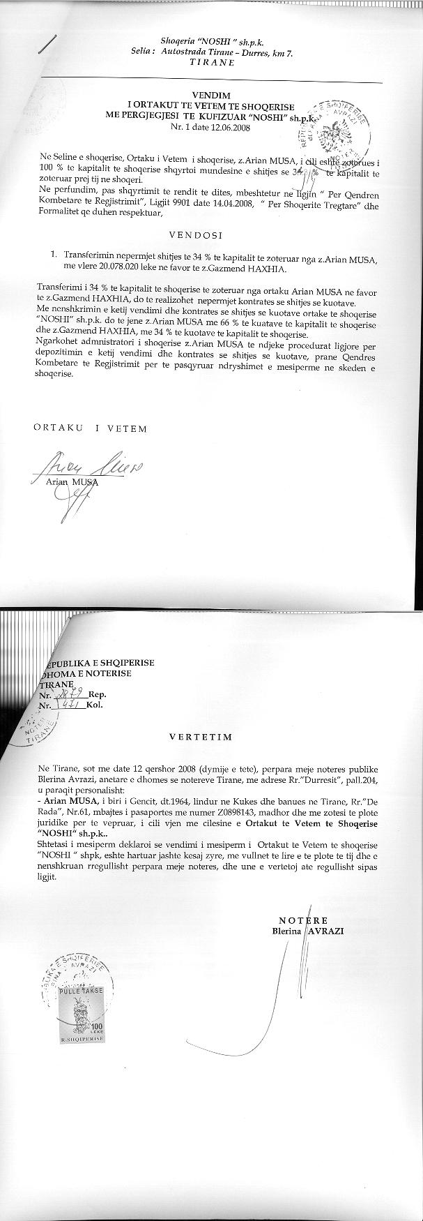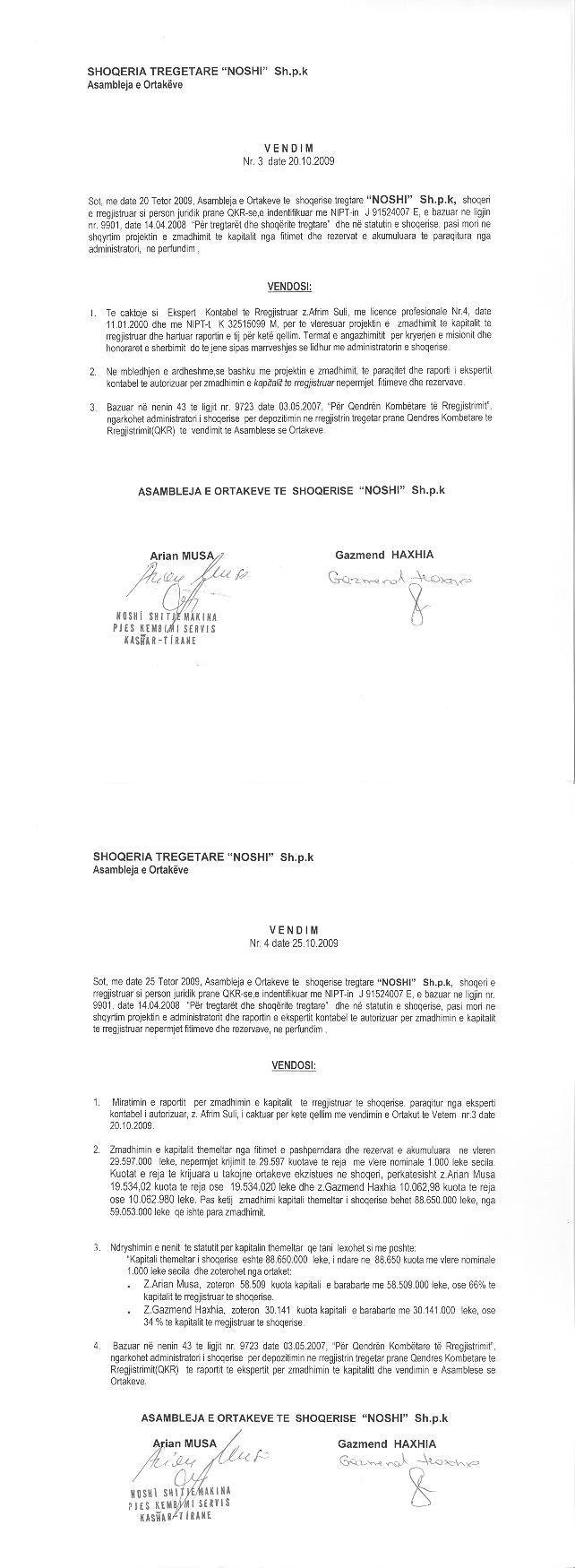→ Ekstrakt Historik i Regjistrit Tregtar date 05.06.2023 → Akt themelimi dhe Statuti i Shoqerise → Vendim i Ortakut te Vetem, Zmadhim Kapitali date 04.07.2002 → Vendim i Ortakut te Vetem, Zmadhim Kapitali date 07.07.2005 → Vendim i Ortakut te Vetem, Zmadhim Kapitali date 23.11.2006 → Vendim i Ortakut te Vetem, Shitje Kuotash Kapitali date 12.06.2008 → Vendim i Asamblese se Ortakeve, Zmadhim Kapitali date 25.10.2009 → Kontrate Pengu Kuotash date 24.01.2017 → Vendim i Asamblese se Ortakeve, Zmadhim Kapitali date 14.08.2018 → Marreveshje Shitblerje Kuotash date 20.08.2018 → Deklarate Noteriale date 31.08.2018 → Marreveshje Shitblerje Kuotash date 17.09.2018 → Kontrate Pengu Kuotash date 13.08.2020 → Ekstrakt Historik i Regjistrit Tregtar date 06.07.2024 |