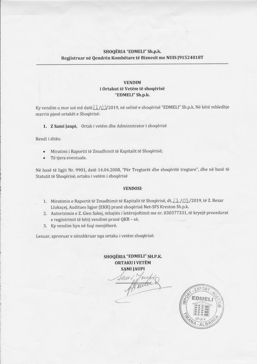 → Ekstrakt historik i regjistrit tregtar 24.05.2021 → Akti i themelimit dhe statuti → Vendimi i ortakut te vetem per miratimin e raportit te zmadhimit te kapitalit, date 27.09.2019 → Vendim i ortakut te vetem per miratimin e raportit te zmadhimit te kapitalit 17.08.2017 |