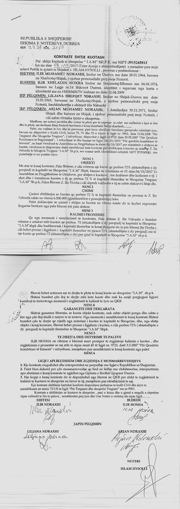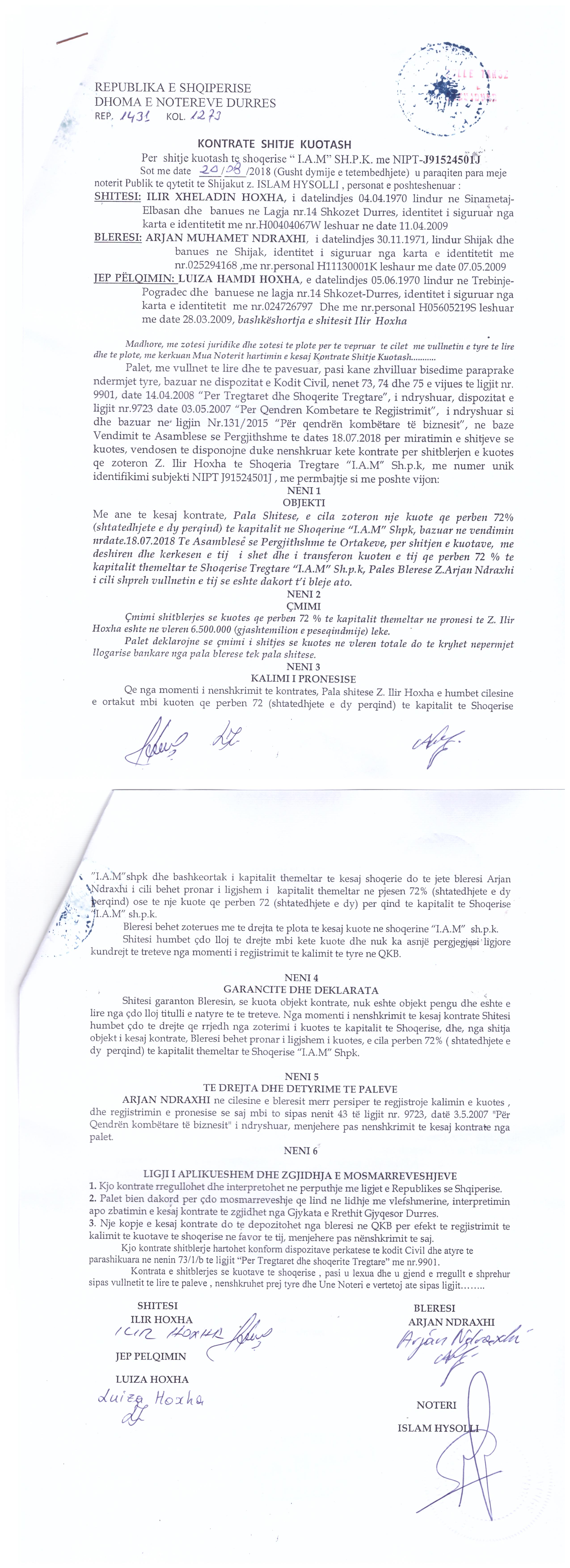 | Çështje Ligjore: | I. Me date 02.12.2015, u nenshkrua marreveshja e bashkimit me përthithje, ndërmjet shoqërisë përthithëse "I. A. M." shpk me NUIS (NIPT) - J91524501J dhe shoqërisë së përthithur "GLAN" shpk. Emri i shoqerise se krijuar nga bashkimi do te jete “IAM” sh.p.k. Kapitali i shoqerise pas bashkimit do te jete 166.100.000 (njëqind e gjashtëdhjetë e gjashte milionë e njëqind mije) leke, i ndare ne dy kuota, 72% te te cilave zotërohen nga Ilir Ndraxhi dhe 28% zotërohen nga Arjan Ndraxhi. |