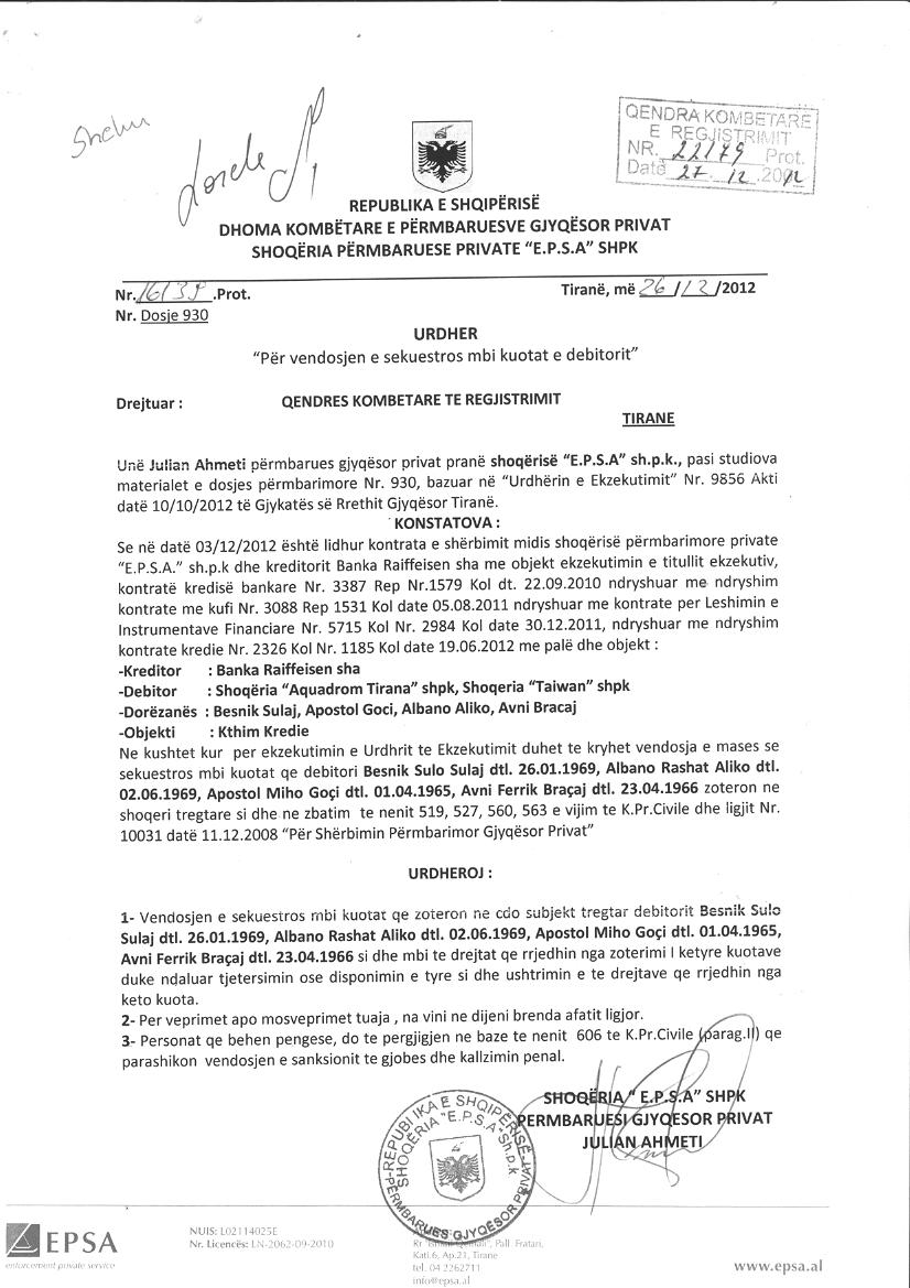 | Çështje Ligjore: | I. Me date 03/01/2013, me ane te Urdhrit per vendosjen e sekuestros mbi kuotat e debitorit nr. 16139 Prot, nr. Dosje 930 dt.26.12.2012 te Shoqerise Permbaruese Private "E.P.S.A" sh.p.k., u urdherua vendosja e sekuestros mbi kuotat qe zoteron ne çdo subjekt tregtar debitorit Albano Aliko, si dhe mbi te drejtat qe rrjedhin nga zoterimi i ketyre kuotave duke ndaluar tjetersimin ose disponimin e tyre si dhe ushtrimin e te drejtave qe rrjedhin nga keto kuota. Kreditor Banka Raiffeisen sha; Objekti Kthim Kredie II. Me date 16/08/2018, me ane te Urdherit Nr. 2418 Prot., Nr. 2223 Regj., date 09.08.2018, lëshuar nga Shoqeria Permbarimore “BAILIFF SERVICES ALBANIA ”, u urdherua vendosja e mases se sekuestros conservative ne kuotat/aksionet e pales debitore si dhe mbi te drejtat qe rrjedhin nga zoterimi i ketyre kuotave duke ndaluar tjetersimin dhe/ose disponimin e tyre, moskryerjen e asnje veprimi tjeter i cili mund te ndryshoje te dhenat e rregjistrit tregtar. Dokumentacioni do te qendroje i bllokuar deri ne nje urdher te dyte nga kjo shoqeri permbarimore. Shoqerise “ASALB. ” sh.p.k., me Nuis (Nipt)- J91710007J, ne masen 50% te aksioneve ne pronesi te Albano Aliko. Kreditor Alpha Bank sh.a.; Objekti Kthim Kredie III. Me date 09/07/2019, me ane te Urdhrit Nr. 3193 Prot., Nr. Dosje 930 dt.09.07.2019 te Shoqerise Permbaruese Private "E.P.S.A" sh.p.k., u urdherua heqja e bllokimit te kuotave/aksioneve dhe e te drejtave qe rrjedhin nga zoterimi i kuotave per debitorin shoqeria “ASALB” SHPK me NIPT-J91710007J, te kerkuar me shkresen nr.16139 Prot., date 26.12.2012. IV. Me date 25/07/2019, me anet e Urdhrit Nr. 2223 Regj., Nr.1696 Prot., date 24.07.2019 leshuar nga shoqeria Shoqeria Permbarimore “Bailiff Services Albania” sh.p.k, u urdherua heqja e mases se sekuestros konservative mbi aktivet e pales debitore shoqeria “ASALB.” SHPK, me NUIS (NIPT) - J91710007J, ne masen 50 % te aksioneve ne pronesi te Albano Aliko, te urdheruar me shkresen Nr.2418 Prot., date 09.08.2018. |