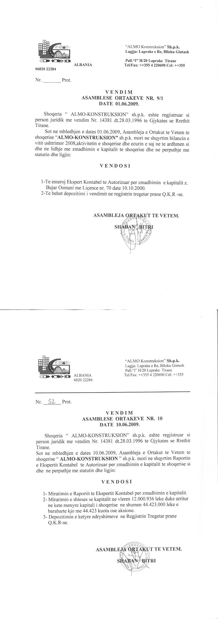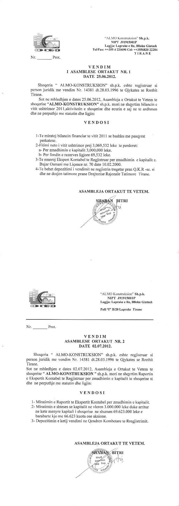 → Ekstrakt historik i regjistrit tregtar 17.03.2021 → Akti i themelimit → Vendimi i ortakeve per zmadhimin e kapitalit 22.04.2019 → Kontrate dhurimi aksionesh 02.07.2014 → Vendimi i ortakut te vetem per rritjen e kapitalit 25.06.2012 → Vendimi i asamblese se ortakeve per zmadhimin e kapitalit 10.06.2009 → Vendimi i asamblese se ortakeve per shtimin e kapitalit 15.07.2020 → Vendimi i asamblese se ortakeve per shtimin e kapitalit 23.06.2018 → Ekstrakti Historik i Regjistrit Tregtar date 03.05.2023 → Vendimi i asamblese se ortakeve per shtimin e kapitalit 14.06.2020 → Vendimi i asamblese se ortakeve per shtimin e kapitalit 25.04.2022 → Ekstrakti Historik i Regjistrit Tregtar date 10.08.2023 → Raport i Ekspertit Kontabel date 19.06.2023 → Ekstrakt Historik i Regjistrit Tregtar date 23.09.2024 → Kontratë Dhurimi Kuotash datë 29.04.2024 → Vendim i Asamblesë së Ortakëve, Zmadhim Kapitali datë 07.05.2024 → Ekstrakt Historik i Regjistrit Tregtar date 06.11.2025 → Vendimi per zvogelimin e kapitalit date 02.04.2025 |