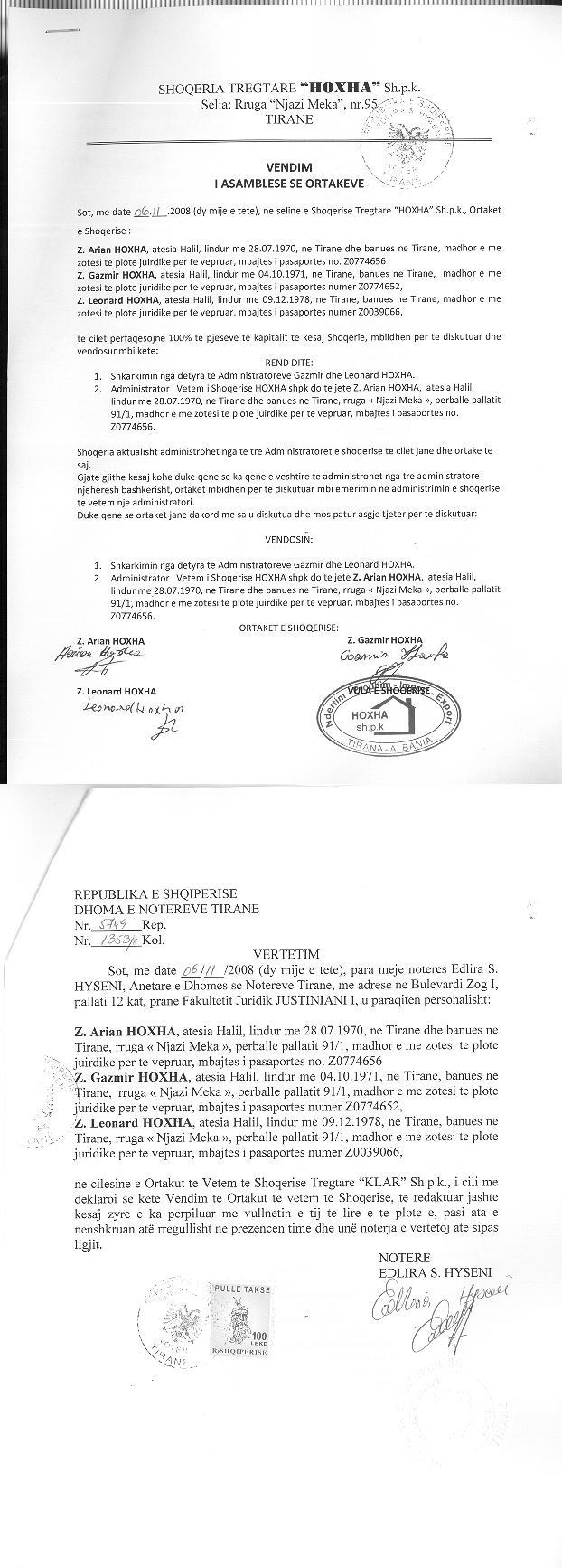 → Ekstrakt Historik i Regjistrit Tregtar, date 11.12.2021 → Kontrate e Shitjes se Kuotave, date 23.03.2007 → Akt themelimi, statuti i shoqerise, date 26.08.1999 → Vendimi i Asamblese se Ortakeve, date 06.11.2008 → Kontrate e shitjes se kuotave, date 15.05.2021 |