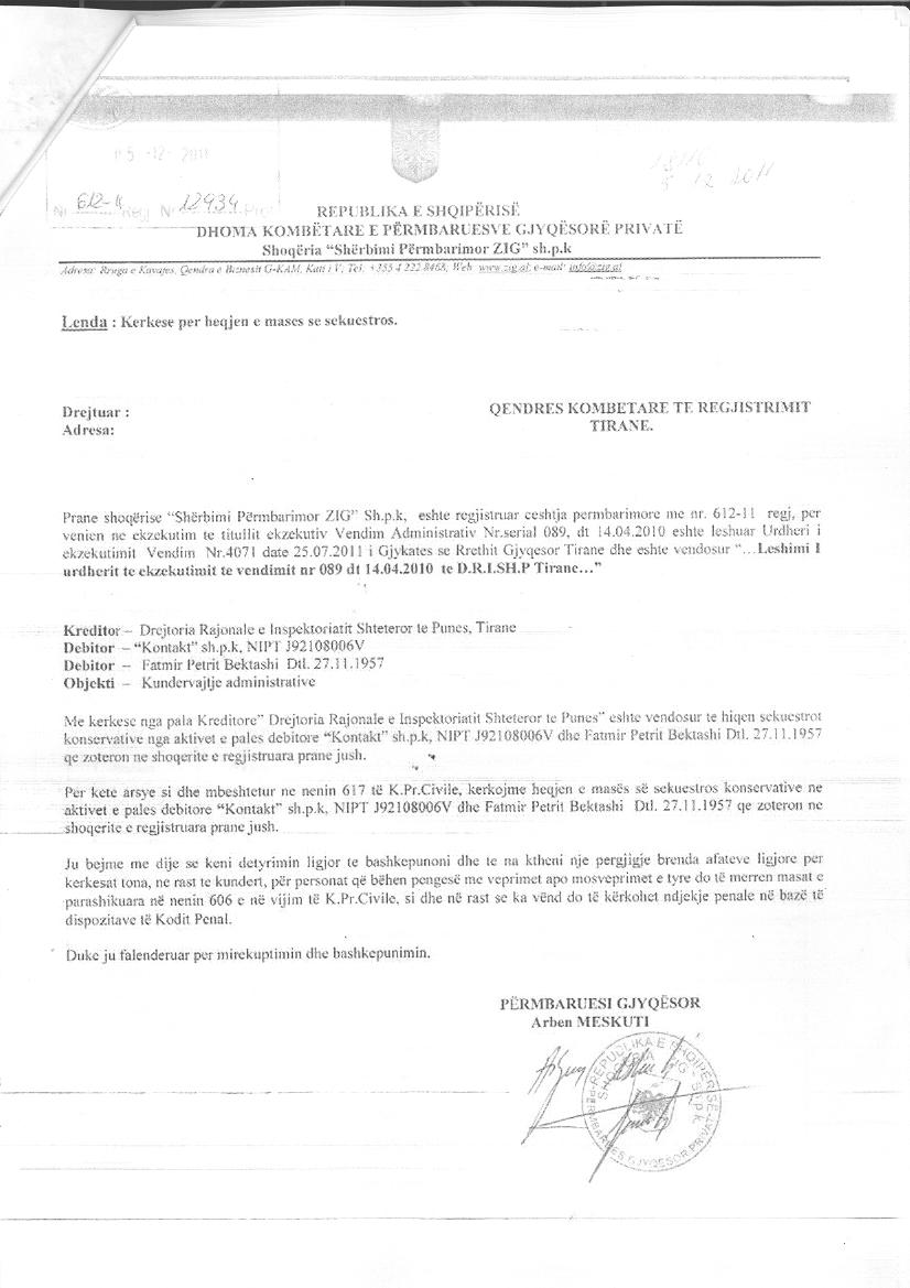 | Çështje Ligjore: | I. Me date 06/12/2011, me ane te Urdherit Nr.12216Prot, 612-11 Regj date 01.12.2011 "Per Venien e Sekuestros Konservative", e leshuar nga Shoqeria “Sherbimi Permbarimor Zig” shpk drejtuar QKR, u urdherua: 1.Vendosja e mases se sekuestros konservative ne aktivet e pales debitore “Kontakt” shpk, NIPT J92108006V dhe Fatmir Petrit Bektashi qe zoteron ne shoqerite e regjistruara. 2 Aktivet e mesiperme do te qendrojne te sekuestruara deri ne nje urdherese te dyte nga ana e jone. Kreditor Drejtoria Rajonale e Inspektoriatit Shteteror te Punes, Tirane; Objekti Kundervajtje administrative. II. Me date 13/12/2011, me ane te Kerkeses Nr.12934Prot, 612-11 Regj date 05.12.2011 "Per heqjen e mases se Sekuestros", e leshuar nga Shoqeria “Sherbimi Permbarimor Zig” shpk drejtuar QKR, u kerkua heqja e mases se sekuestros konservative ne aktivet e pales debitore “Kontakt” shpk, NIPT J92108006V dhe Fatmir Petrit Bektashi qe zoteron ne shoqeri te regjistruara. III. Me date 15/07/2020, me ane te Vendimit date 04.06.2020, u vendos nenshkrimi i disa kontratave te hipotekimit (te cituara ne akt), kontrata ne te cilat shoqeria KONTAKT paraqitet si Hipotekues dhe te çdo akti tjeter me Banken Kombetare Tregtare SHA dhe dhenia e tagrave te perfaqesimit te shoqerise, ortakut dhe administratorit te saj z. Fatmir Bektashi, per nenshkrimin e ketyre kontratave te Hipotekimit. |