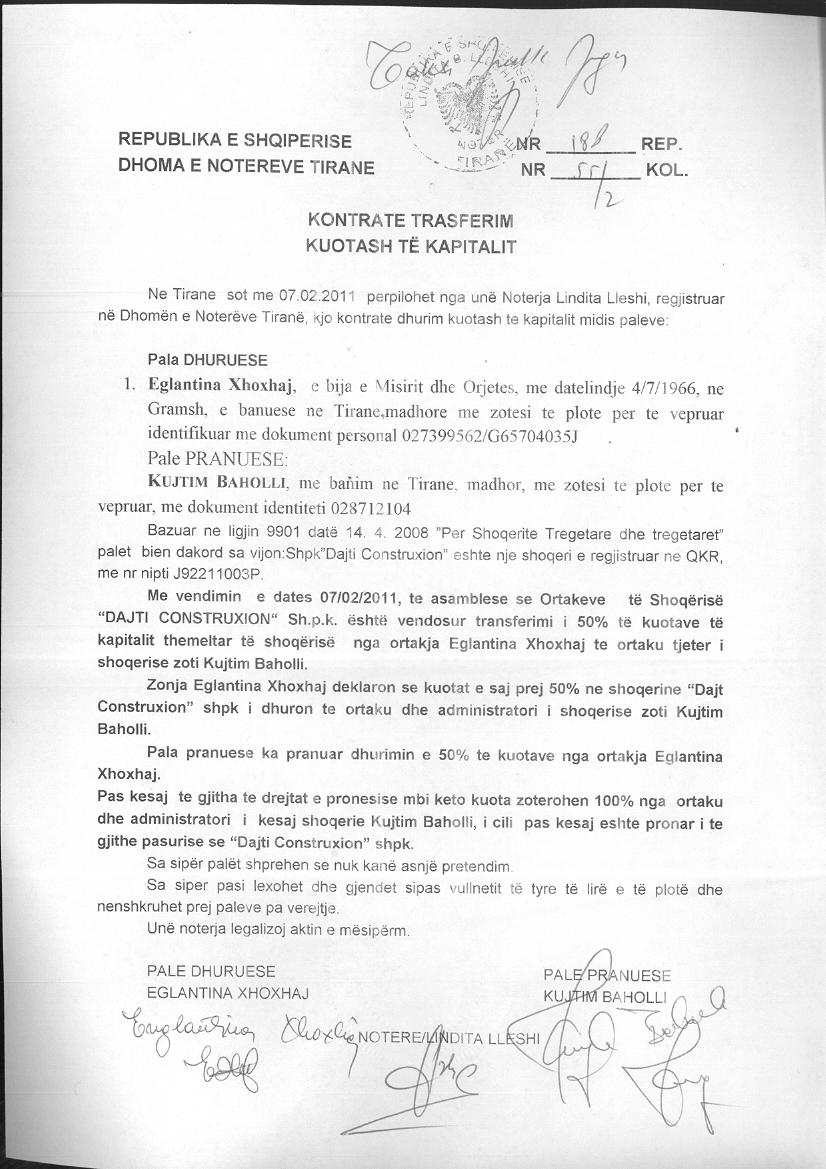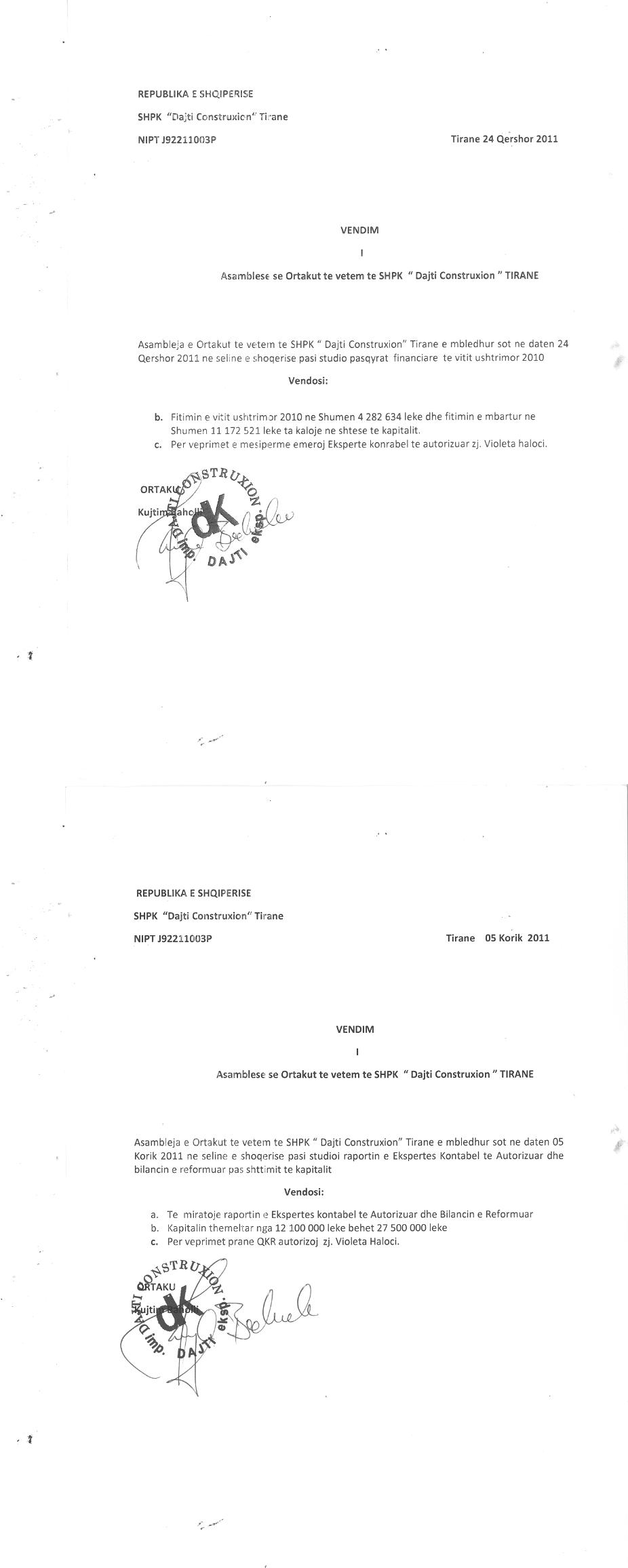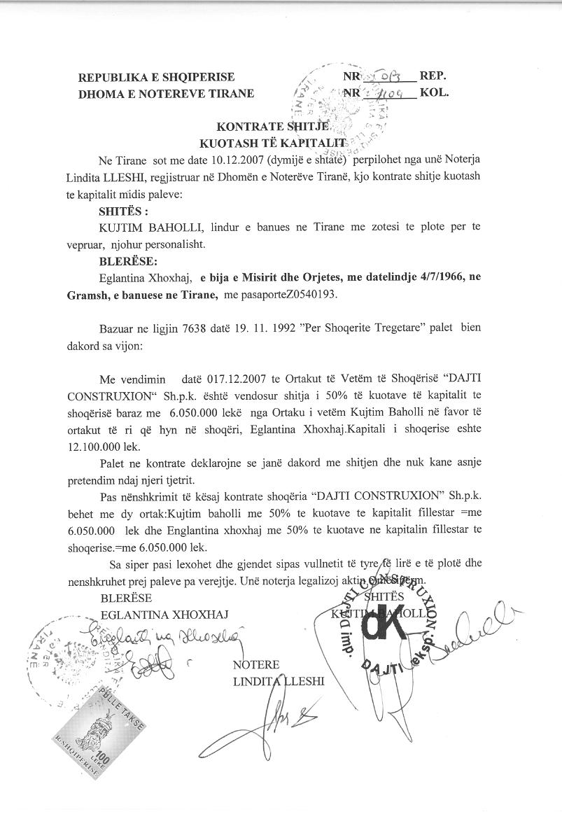 → Ekstrakt Historik i Regjistrit Tregtar, date 14.01.2022 → Dokumenta te ndryshme nder vite → Kontrate e shitjes se kuotave, date 10.12.2007 → Kontrate e dhurimit te kuotave, date 07.02.2011 → Vendimi i ortakut te vetem, date 24.06.2011 → Vendimi i asamblese se ortakut, date 12.10.2020 |