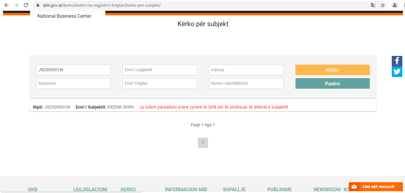→ Mungesa e te dhenave ne QKB per shoqerine Erzeni shpk, date 17.07.2021 |