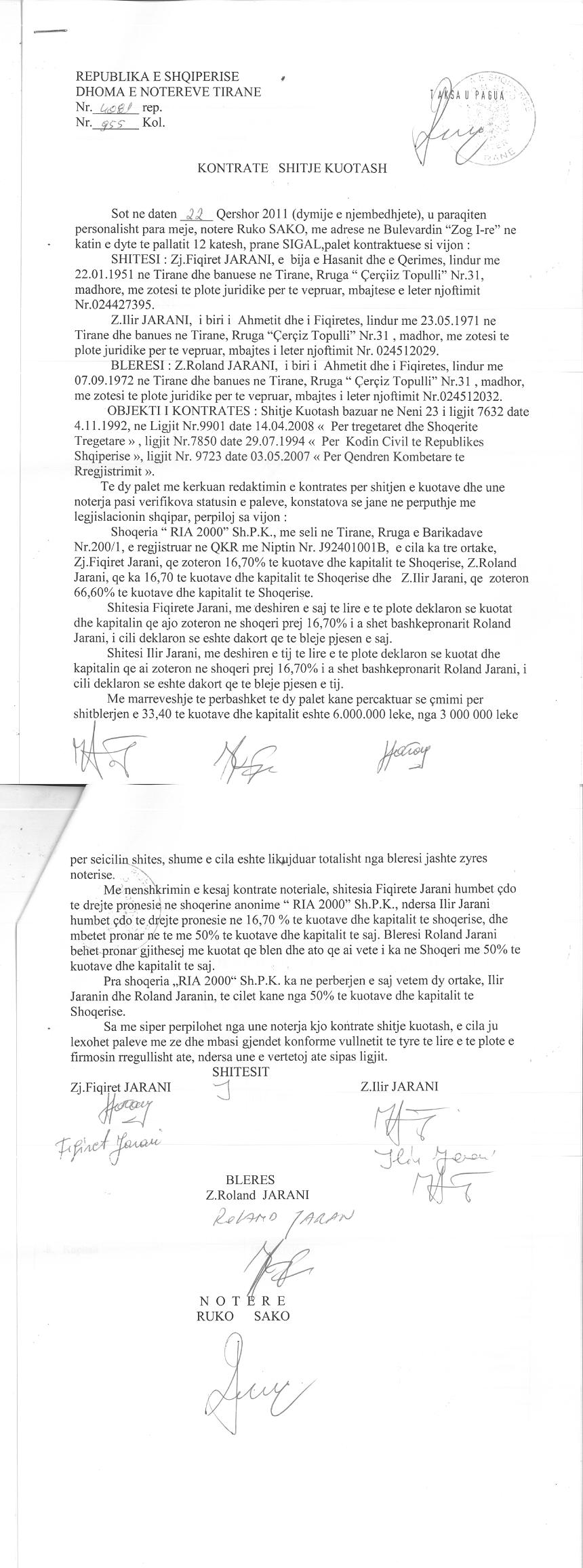 → Ekstrakt historik i regjistrit tregtar date 04.12.2021 → Kontrate themelimi dhe statuti → Vendim i asamblese se ortakeve per zmadhimin e kapitalit date 15.05.2012 → Kontrate shit-blerje kuotash date 08.03.2000 → Kontrate shitje kuotash date 22.06.2011 → Vendim i asamblese se ortakeve per zmadhimin e kapitalit date 29.05.2015 |