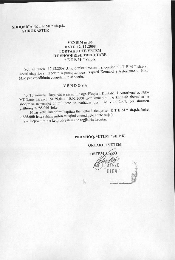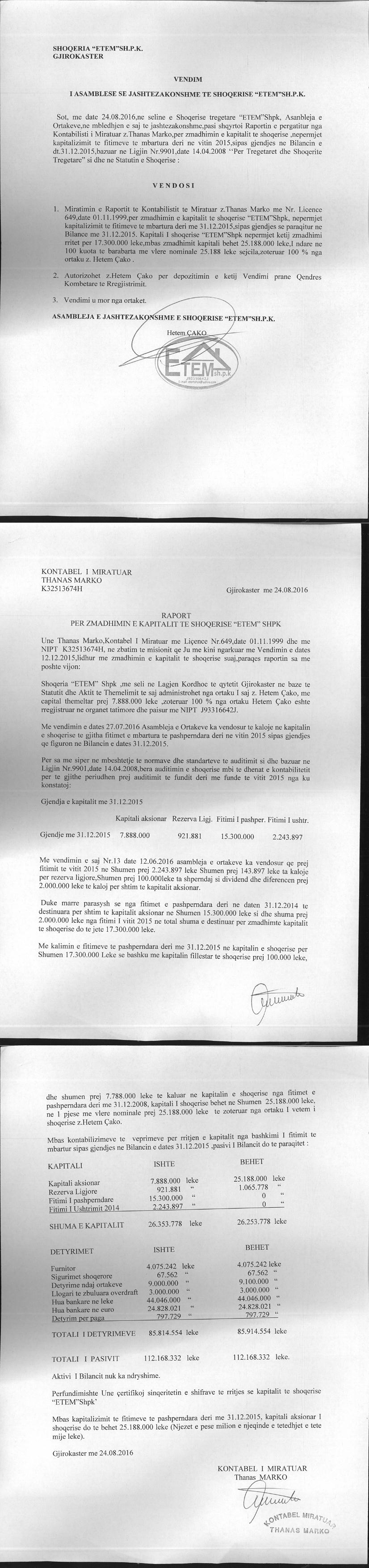 → Ekstrakt historik i regjistrit tregtar 15.11.2021 → Akti i themelimit → Vendimi i ortakut te vetem per zmadhimin e kapitalit 12.12.2008 → Vendimi i asamblese per zmadhimin e kapitalit 24.08.2016 → Vendimi i asamblese per zmadhimin e kapitalit 11.09.2017 → Vendimi i asamblese per zmadhimin e kapitalit 11.09.2019 → Vendim i Ortakut te Vetem, date 20.11.2019 → Vendim i Ortakut te vetem, date 27.07.2020 → Vendimi i Ortakut te vetem, date 11.8.2020 |