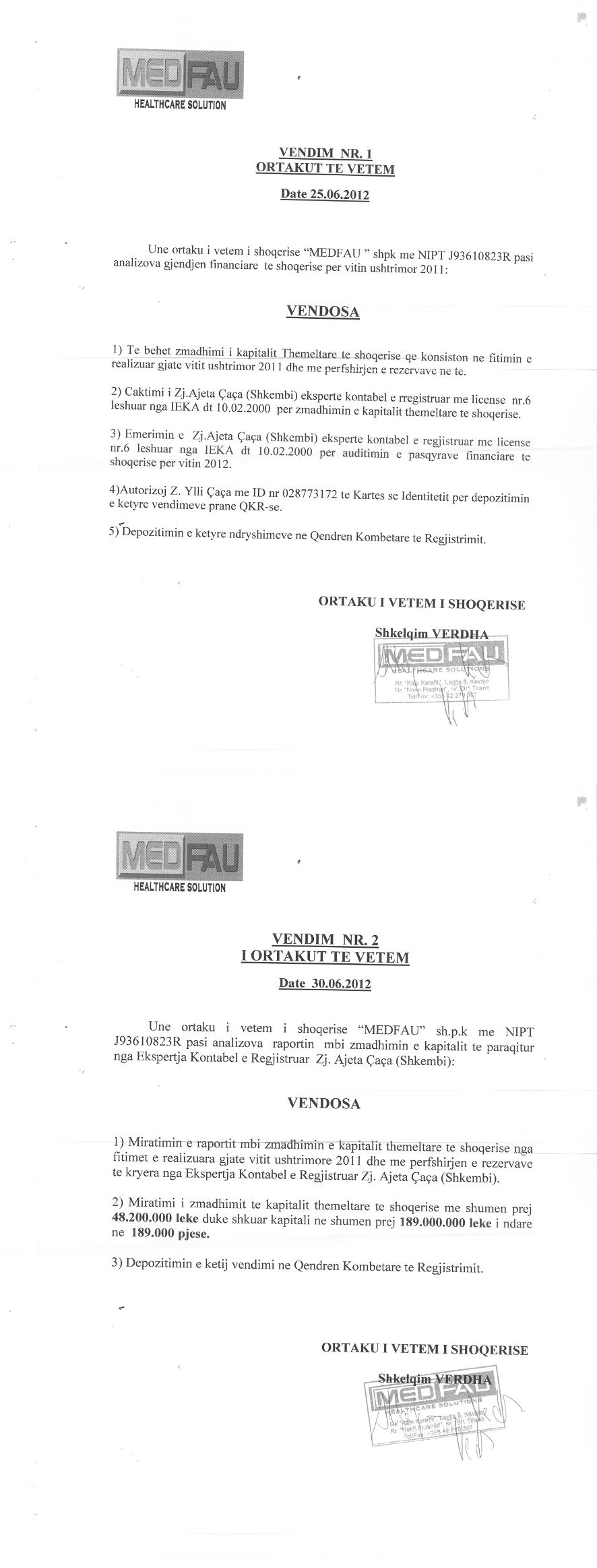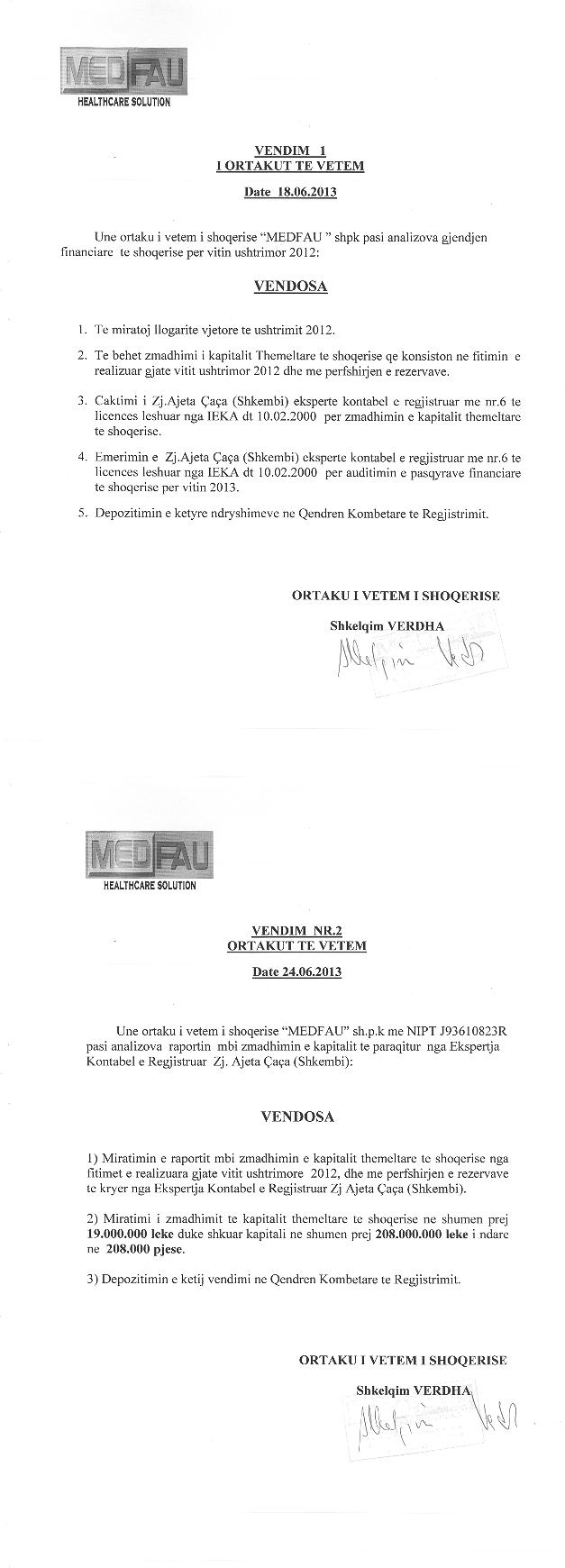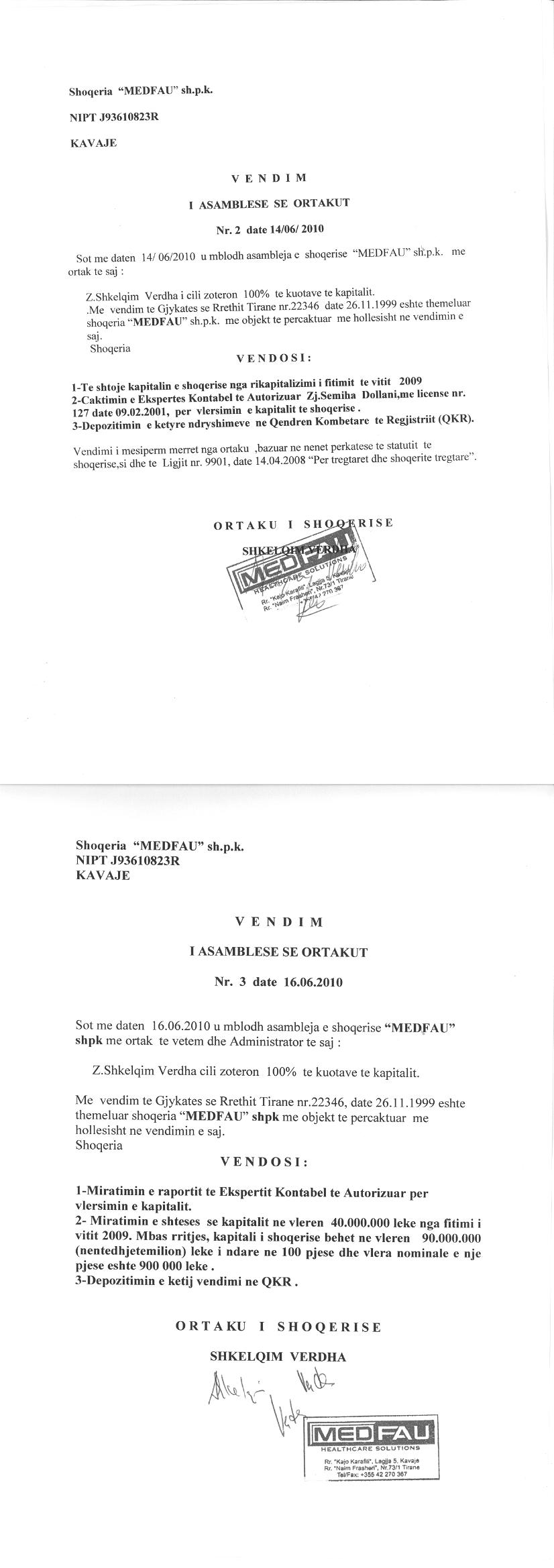 → Ekstrakti Historik i Regjistrit Tregtar date 22.07.2022 → Akt themelimi dhe Statuti i Shoqerise → Vendim i Ortakut te Vetem, Zmadhim Kapitali date 29.06.2006 → Raport Zmadhim Kapitali date 28.06.2008 → Vendim i Ortakut te Vetem, Zmadhim Kapitali date 18.06.2009 → Vendim i Ortakut te Vetem, Zmadhim Kapitali date 16.06.2010 → Vendim i Ortakut te Vetem, Zmadhim Kapitali date 16.06.2011 → Vendim i Ortakut te Vetem, Zmadhim Kapitali date 30.06.2012 → Vendim i Ortakut te Vetem, Zmadhim Kapitali date 24.06.2013 → Ekstrakt historik i regjistrit tregtar date 08.12.2025 |