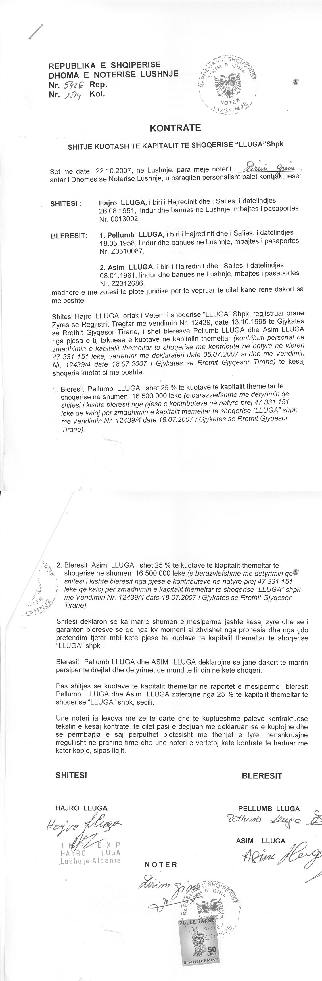 → Ekstrakti Historik i Regjistrit Tregtar date 19.08.2024 → Statuti i Shoqerise → Kontrate e shitjes se kuotave date 22.10.2007 → Vendim i Gjykates se Apelit Vlore date 29.05.2019 → Kontrate e dhurimit te kuotave date 25.12.2023 → Urdher per venien e sekuestros konservative date 15.10.2019 |