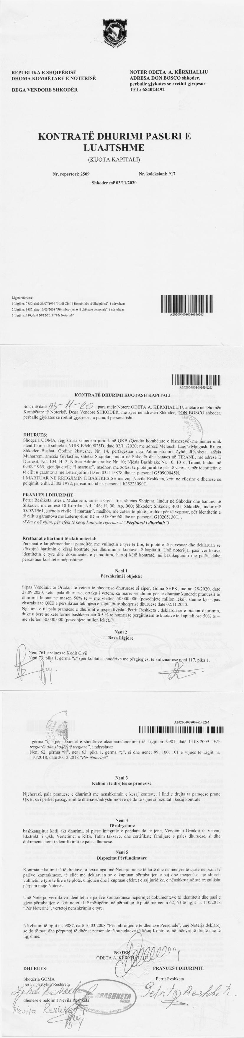 → Ekstrakt Historik i Regjistrit Tregtar date 06.06.2023 → Akt themelimi dhe Statuti i Shoqerise → Kontrate Shitblerje Kuotash date 25.12.2000 → Vendim i Asamblese se Ortakeve, Zmadhim Kapitali ne Natyre date 30.11.2003 → Kontrate Shitblerje Kuotash date 28.03.2006 → Vendim i Ortakut te Vetem, Zmadhim Kapitali date 20.11.2014 → Kontrate Dhurimi Kuotash date 03.11.2020 |
