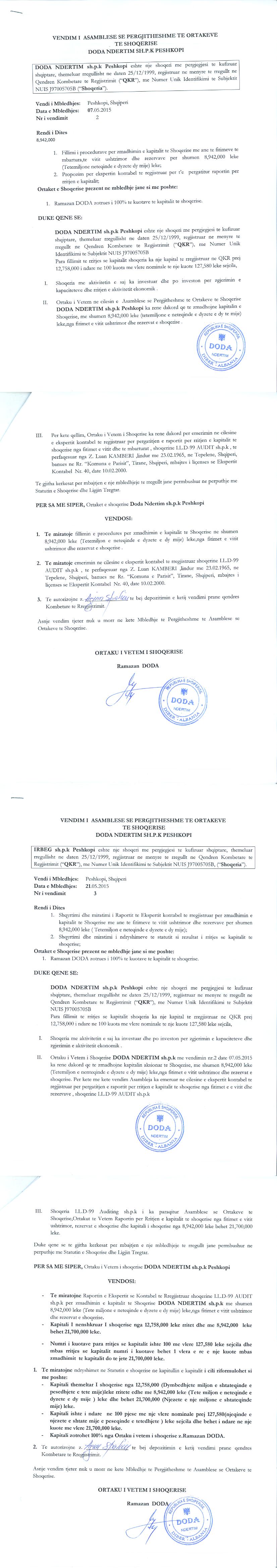 → Ekstrakt historik i regjistrit tregtar 09.06.2021 → Akti i themelimit dhe statuti → Vendimi i asamblese se ortakeve per zmadhimin e kapitalit date 07.05.2015 → Vendimi i asamblese se ortakeve per zmadhimin e kapitalit date 07.08.2013 → Ekstrakt historik i regjistrit tregtar date 20.12.2025 → Vendim i ortakut te vetem per zmadhimin e kapitalit date 30.06.2023 |