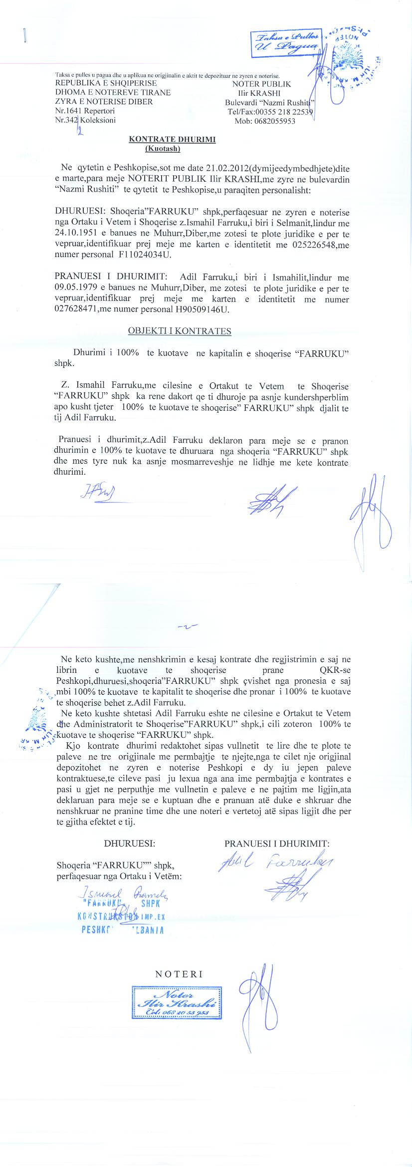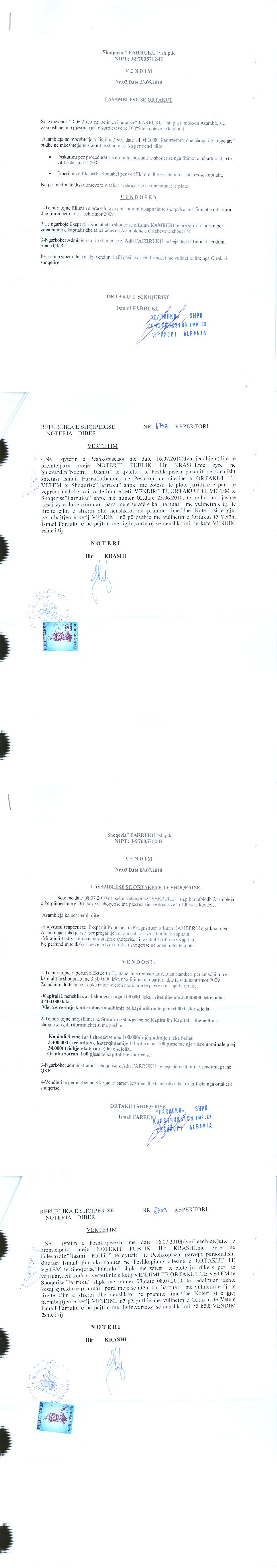 → Ekstrakt historik i regjistrit tregtar date 12.10.2021 → Akti i themelimit dhe statuti → Kontrate dhurimi kuotash date 21.02.2012 → Vendim i asamblese se ortakut per zmadhimin e kapitalit date 23.06.2010 |