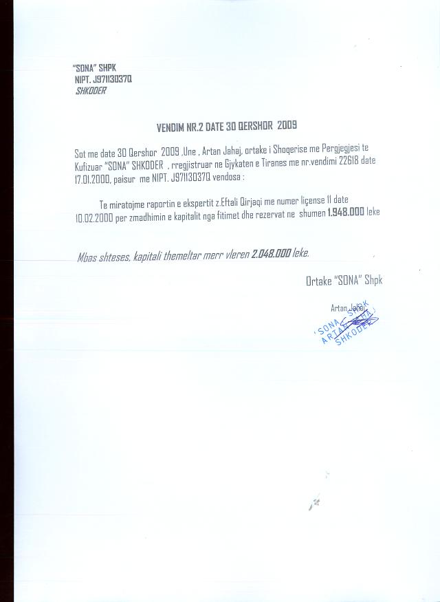 → Ekstrakt historik i regjistrit tregtar 11.02.2022 → Vendimi I ortakut te vetem per zmadhimin e kapitalit 30.06.2009 |